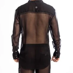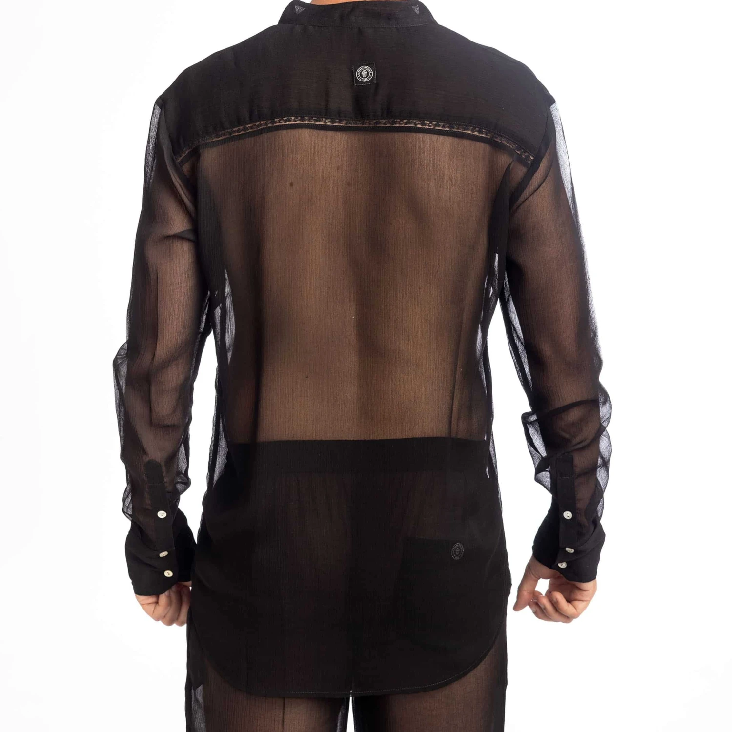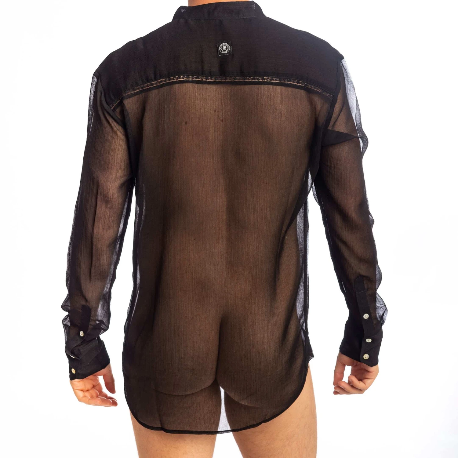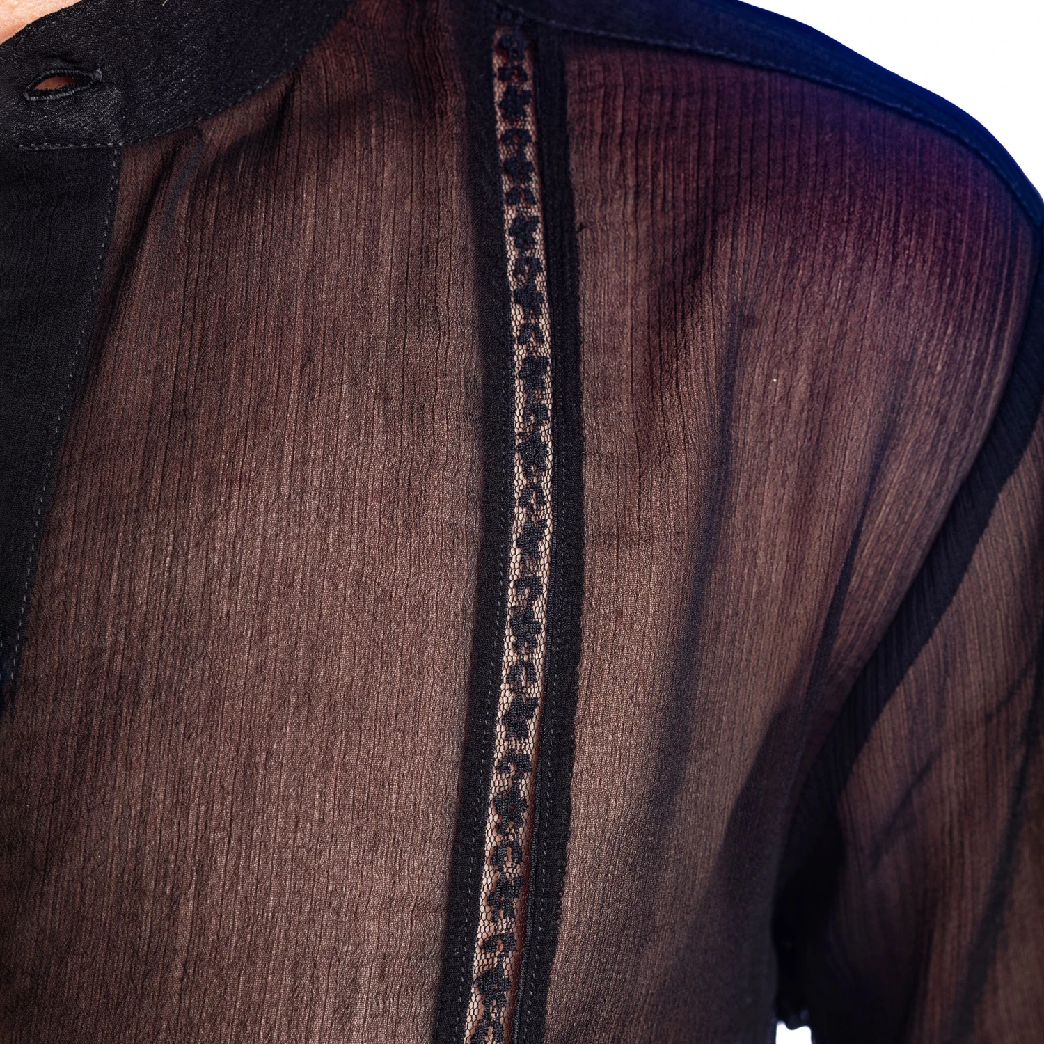 Chemise tunique raffinée en mousseline légère et totalement transparente. Détails en dentelle. Col tunisien à 3 boutons. Manches longues avec poignets.