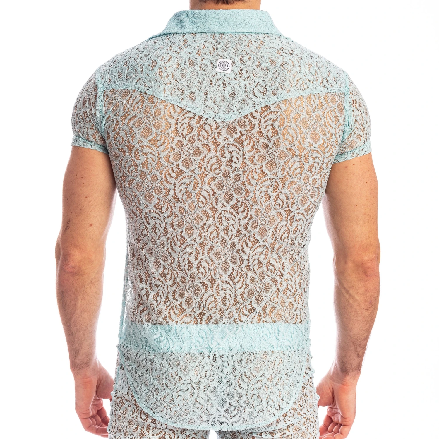 Chemise en dentelle florale transparente de couleur pastel. Coupe cintrĂ©e arrondie en bas. Manches courtes. Patte de boutonnage invisible. Logo L’homme Invisible cousu en haut du dos.