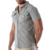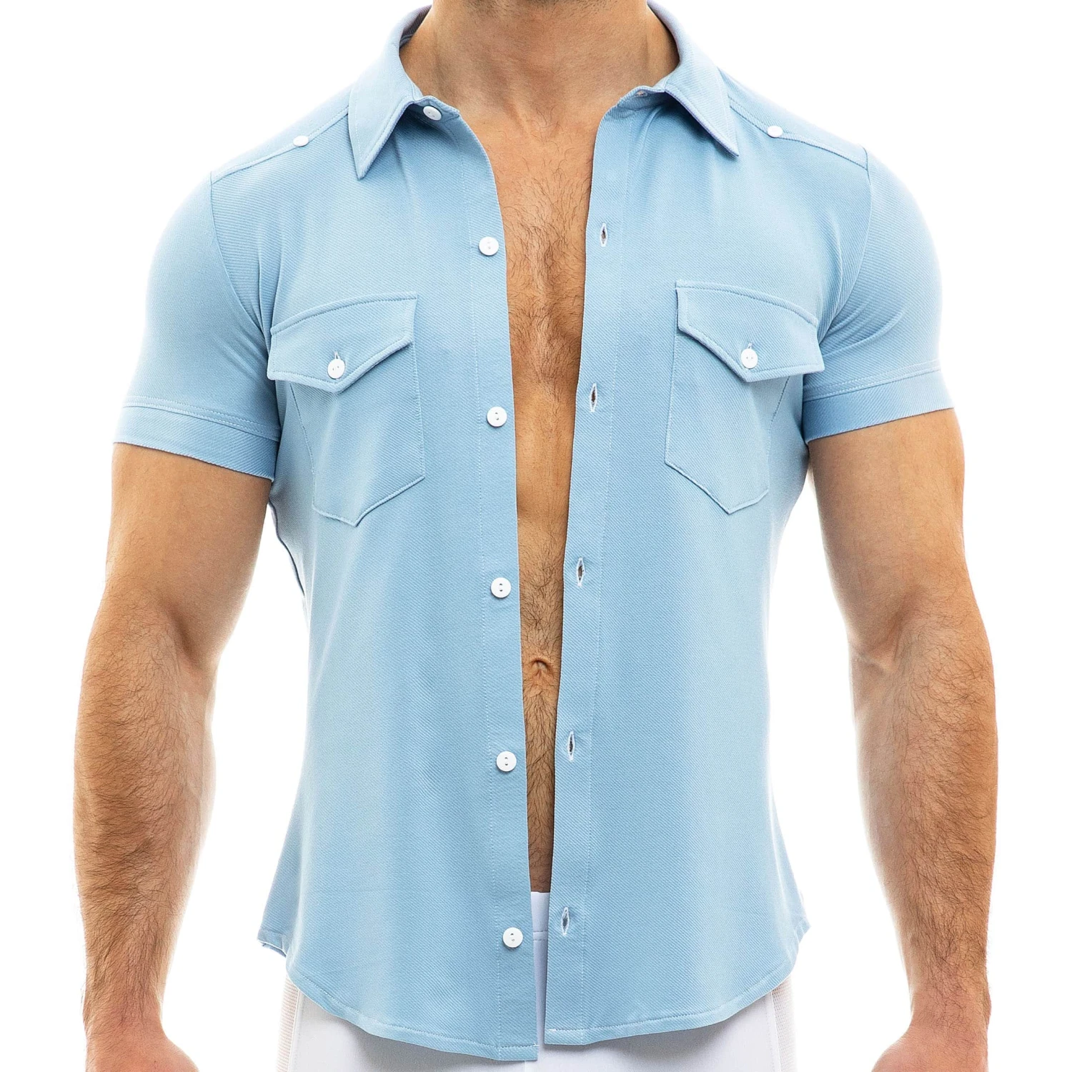 Chemisette cintrée très sexy de couleur unie en mélange de viscose et de microfibre imitant le jeans. Fermeture 6 boutons. 2 poches sur la poitrine. Rivets métalliques signés Modus Vivendi.
