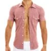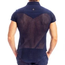 Chemisette cintrée trÚs sexy de couleur unie en mélange de viscose et de microfibre imitant le jeans. Fermeture 6 boutons. 2 poches sur la poitrine. Rivets métalliques signés Modus Vivendi.