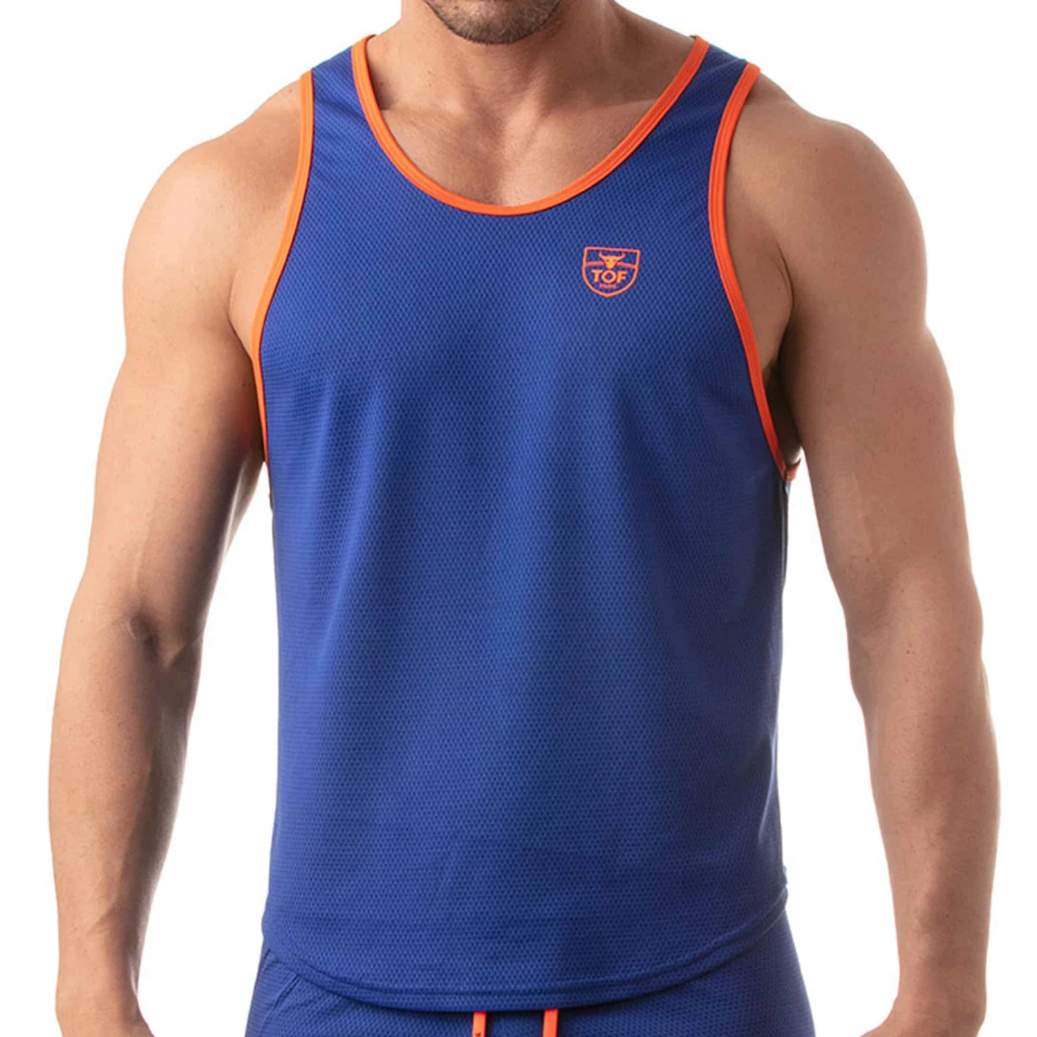 Débardeur sport en mesh léger et respirant. Larges ouvertures sous les bras. Détails de couleur contrastée. Ecusson TOF Paris imprimé sur la poitrine. Fabrication française.
