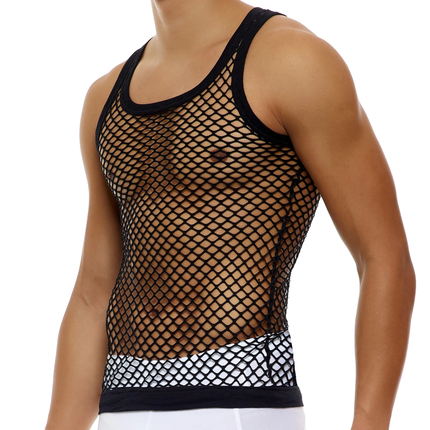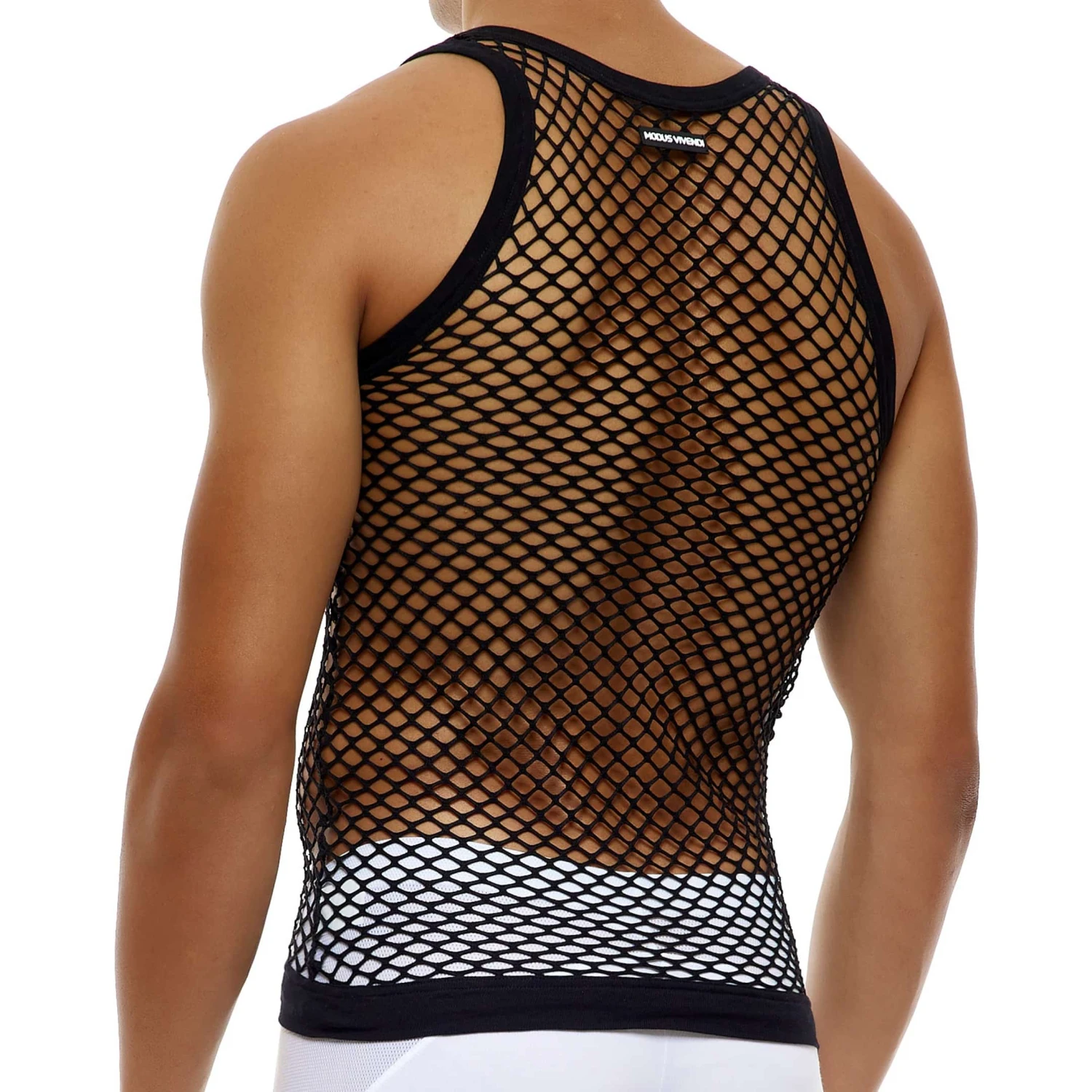 DĂ©bardeur trĂšs sexy et provocant en rĂ©sille dont le maillage extra large laisse peu de place Ă l’imagination. Coupe trĂšs ajustĂ©e mettant en valeur votre musculature. Etiquette Modus Vivendi cousue en haut du dos.