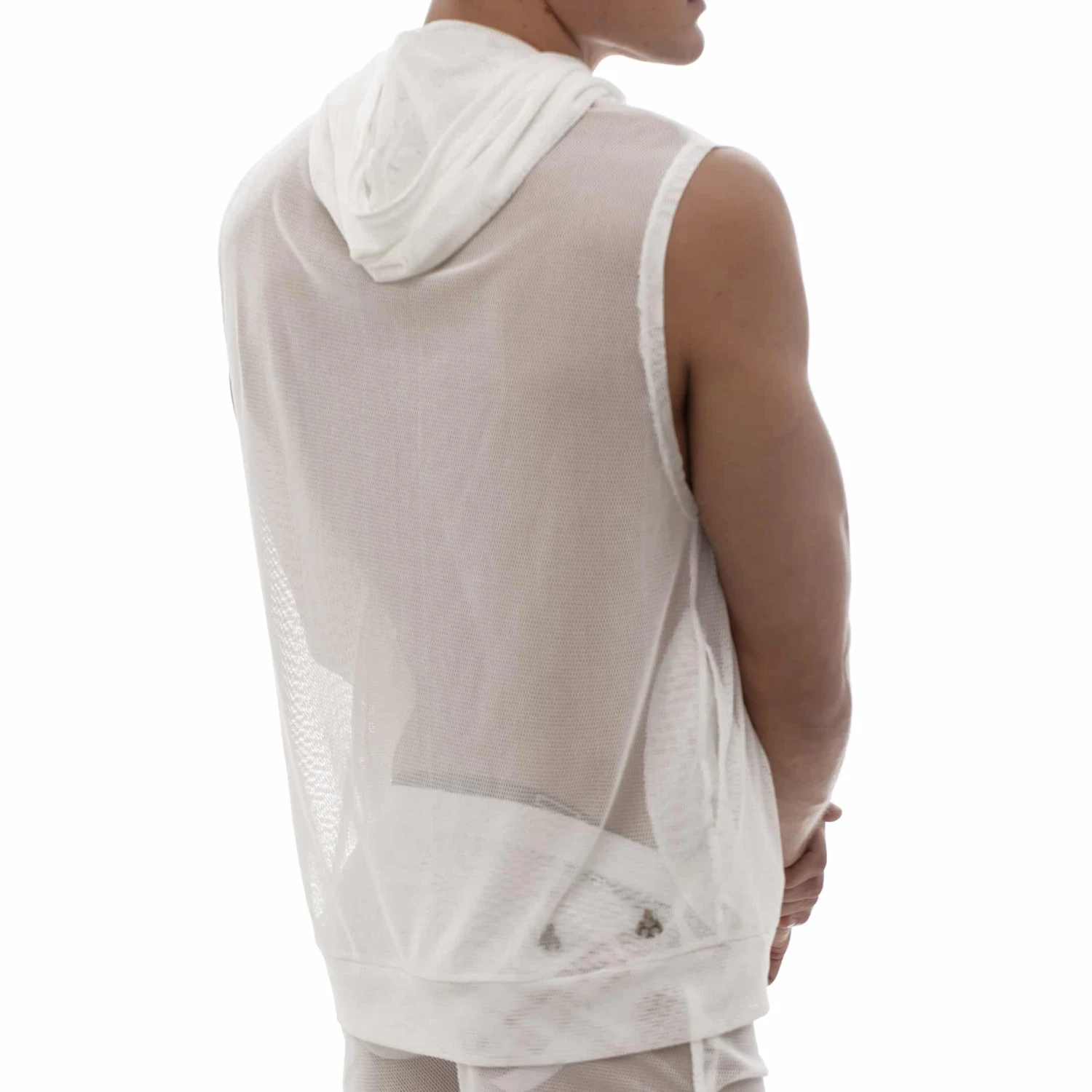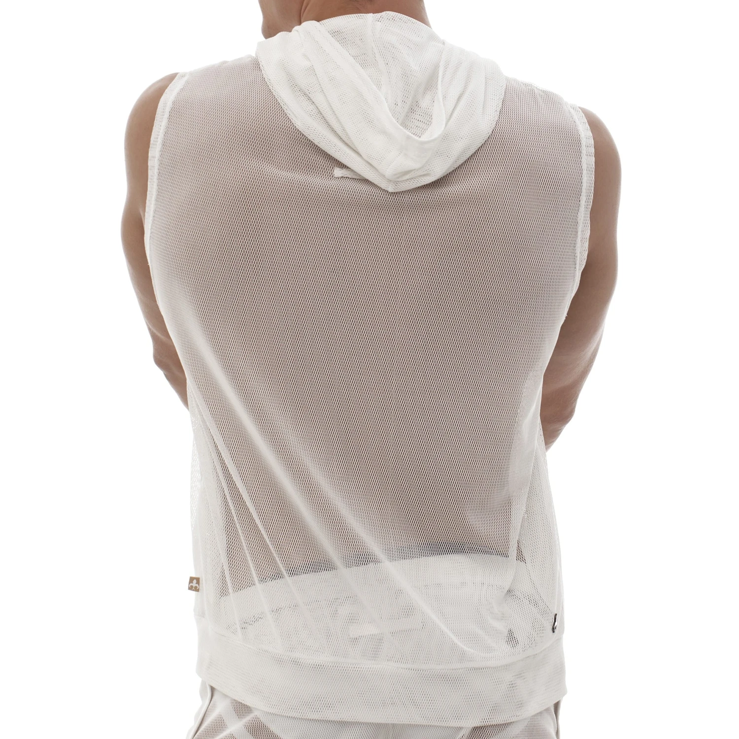 Débardeur sport et sexy en mesh ajouré et totalement transparent. Capuche avec cordon de serrage. 2 poches.