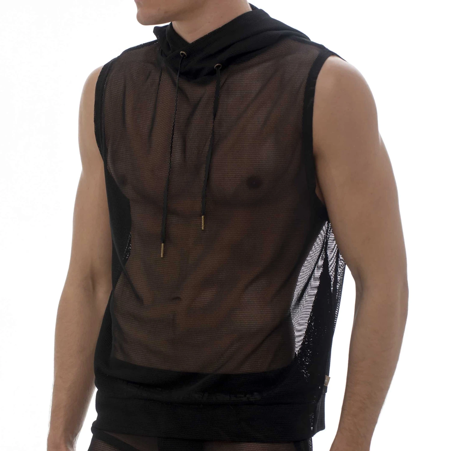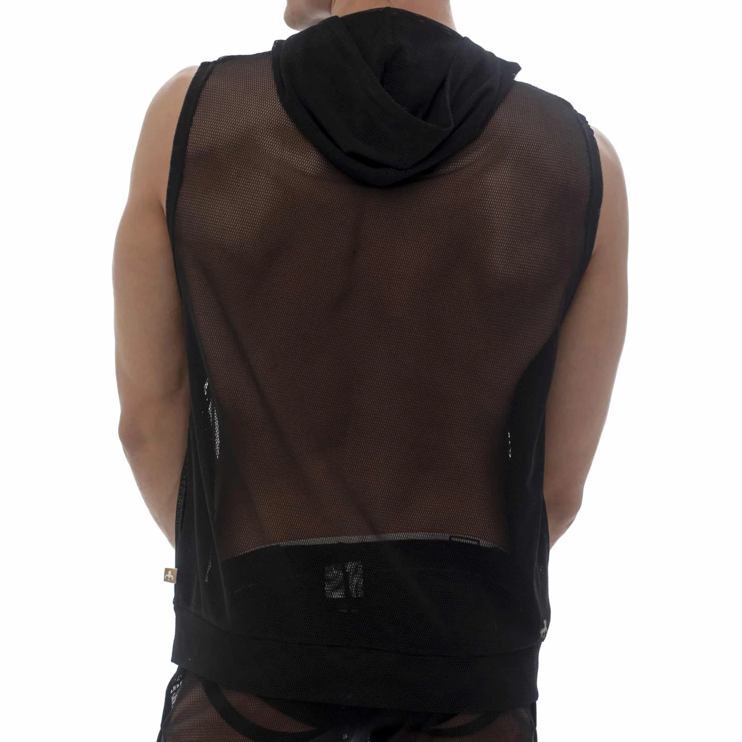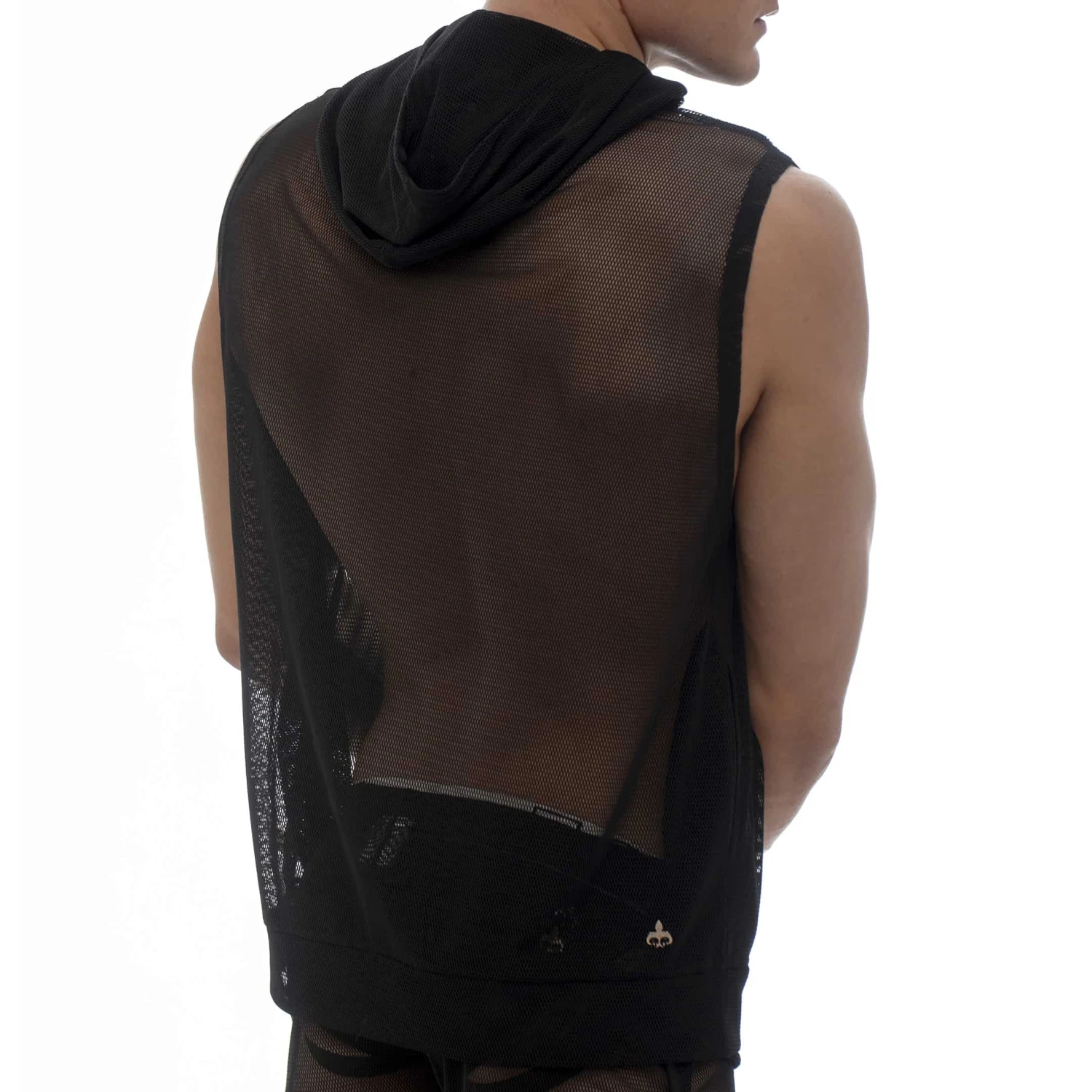 Débardeur sport et sexy en mesh ajouré et totalement transparent. Capuche avec cordon de serrage. 2 poches.