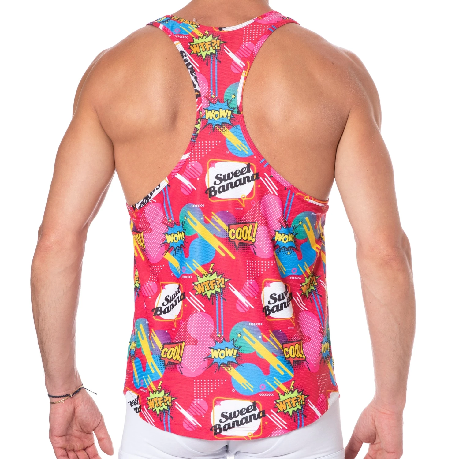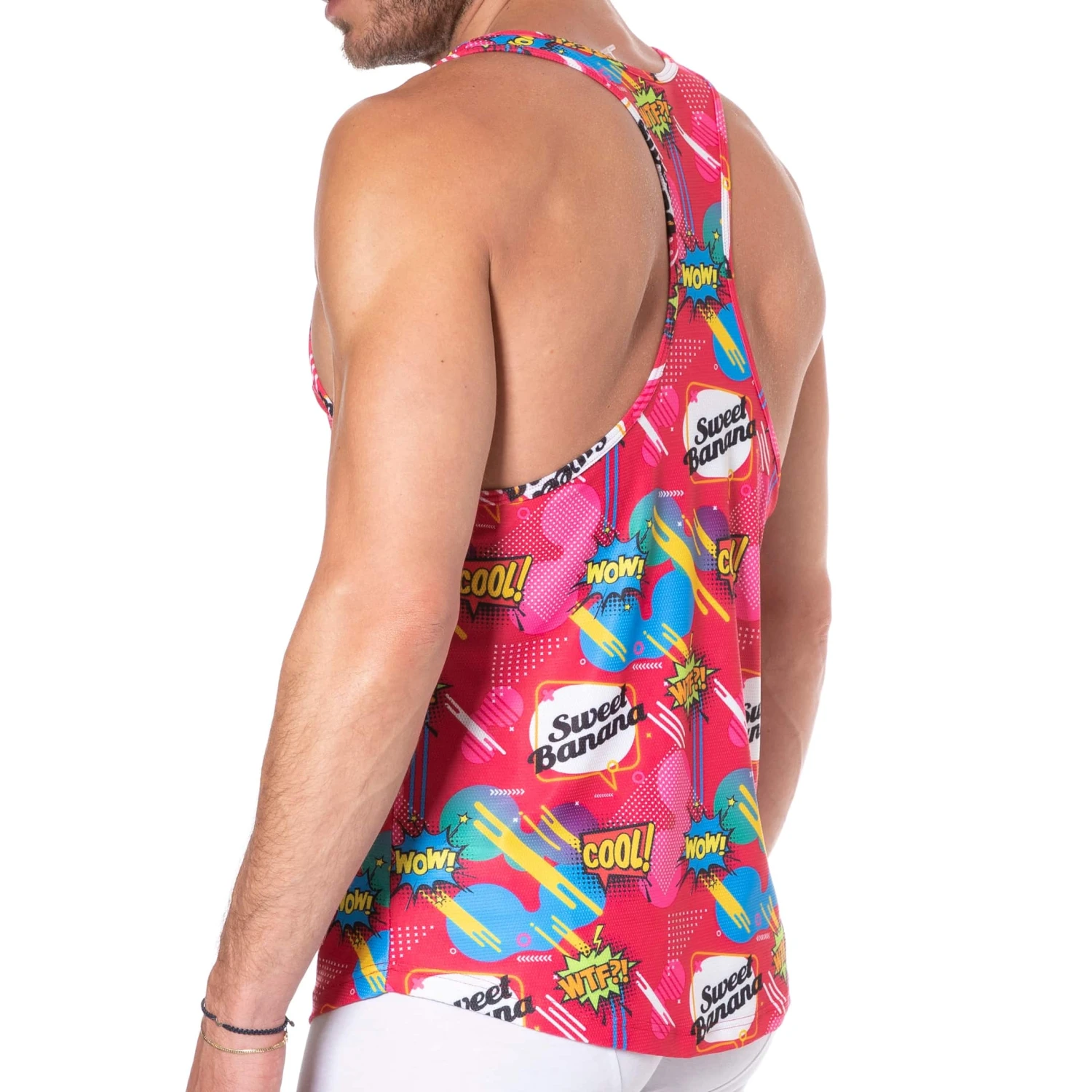 Débardeur ajusté en résille extensible, légÚre et respirante. Imprimé cartoon trÚs tendance. Coupe arrondie en bas. Dos nageur. Fabrication 100% italienne.
