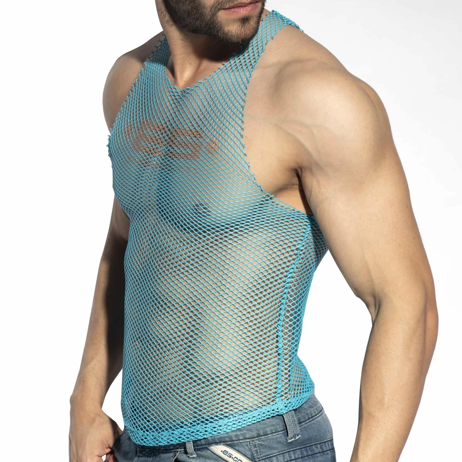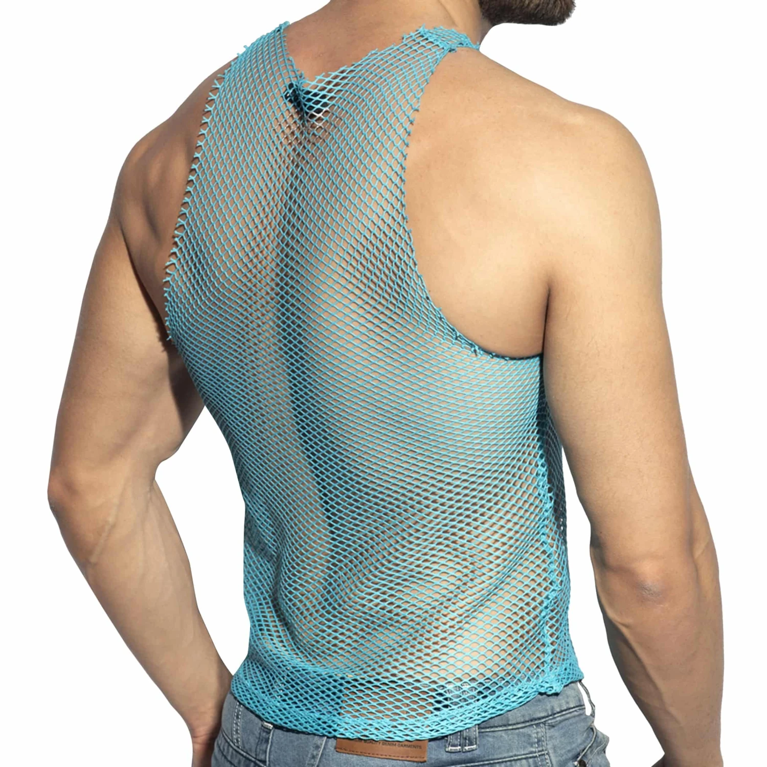 Débardeur en résille à maille large de couleur intense. Col rond et dos nageur. Grand logo ES Collection imprimé sur la poitrine.
