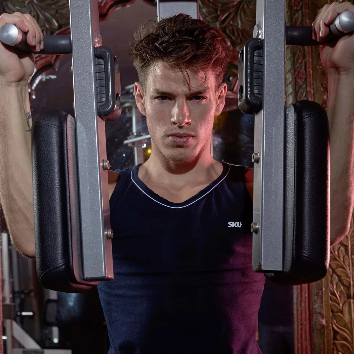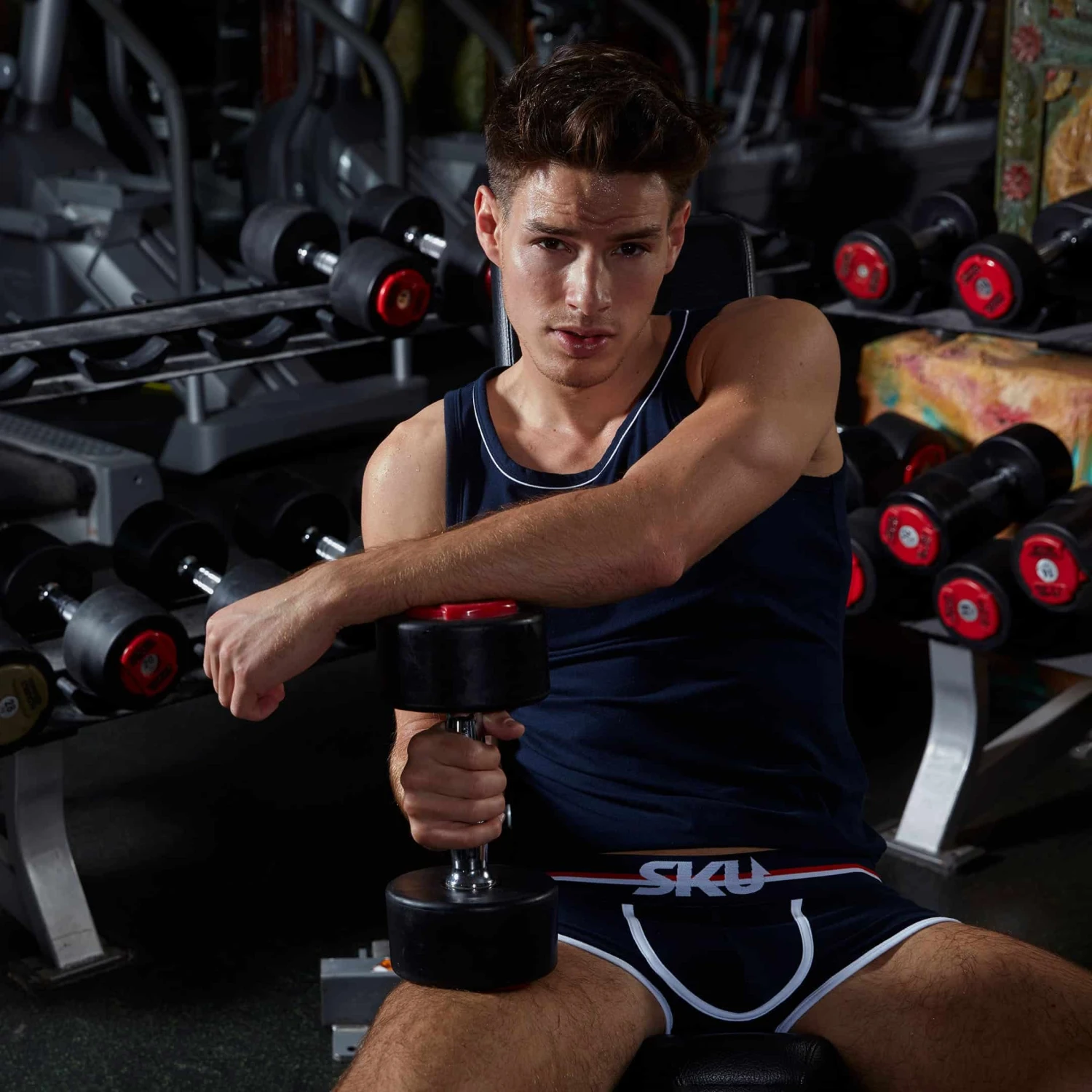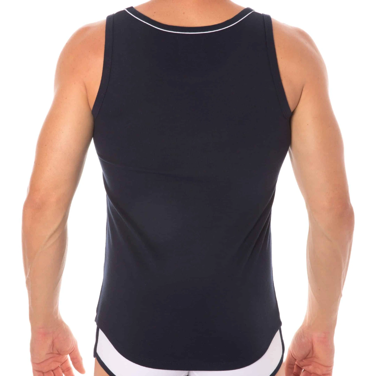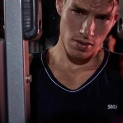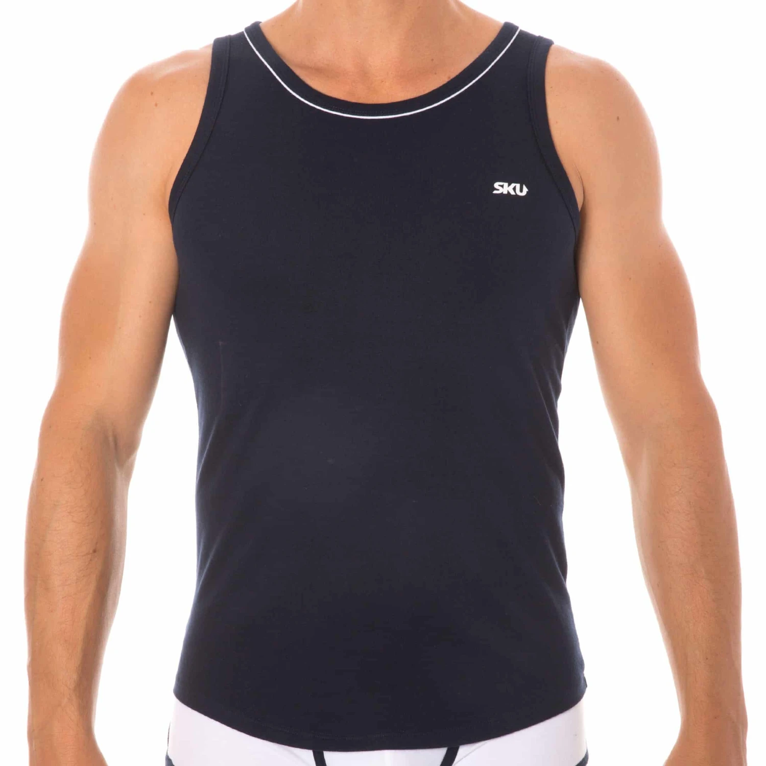 Débardeur sport et sexy en coton premium doux et extensible de couleur intense. Cintré juste comme il faut, il valorisera votre musculature sans gêner vos mouvements. Coupe courte et arrondie en bas, pour tomber parfaitement sur un pantalon. Le col rond est subtilement souligné par un liseré de couleur contrastée. Logo SKU sur la poitrine.