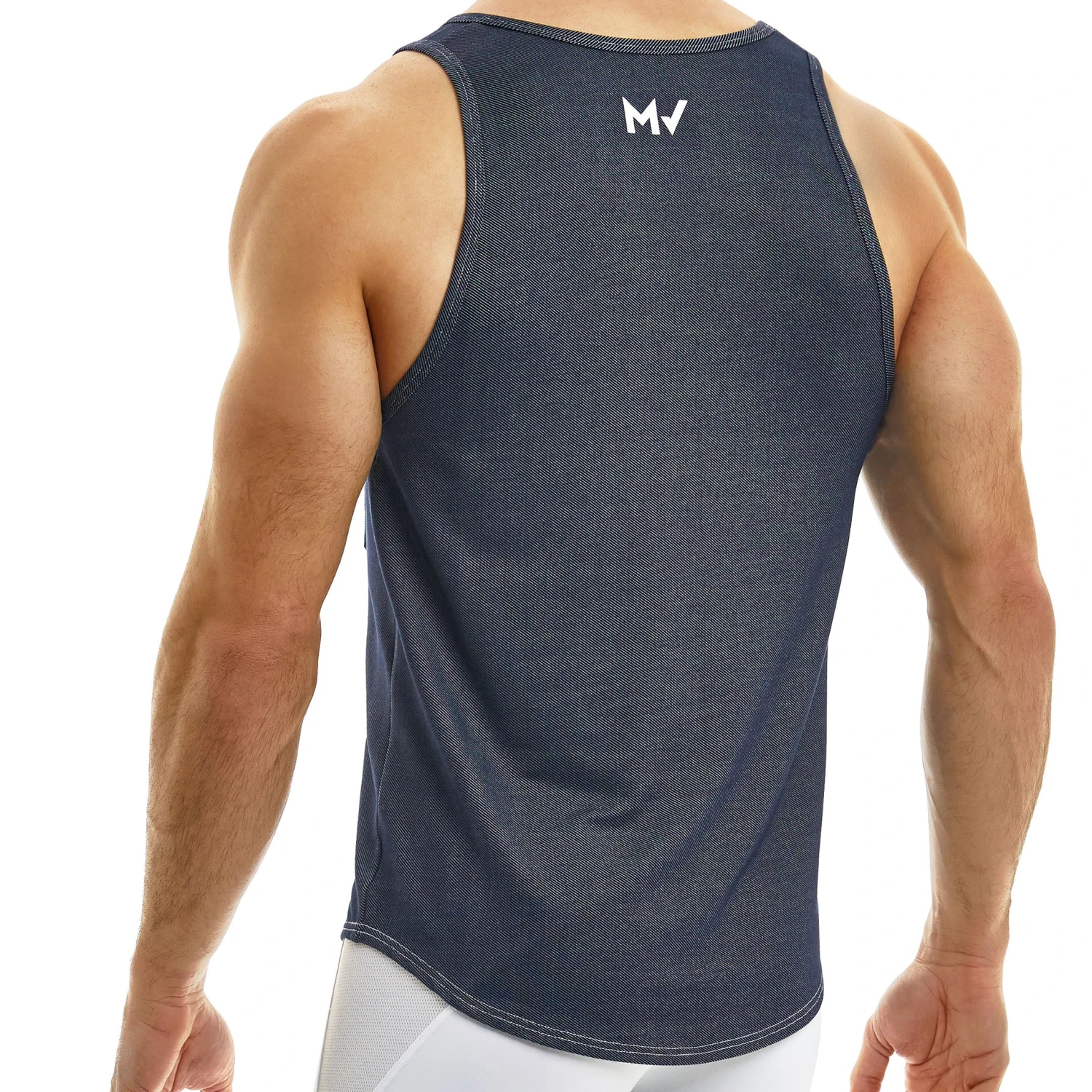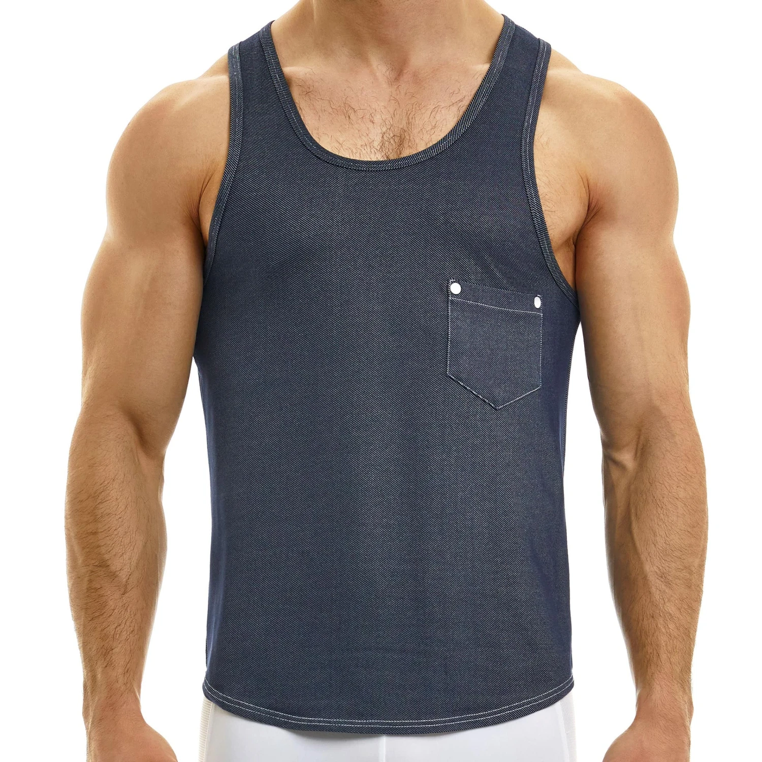Débardeur ajusté en mélange de viscose et de microfibre douce et agréable à porter. Imprimé et coutures imitant le jeans. Coupe courte et arrondie en bas, pour tomber parfaitement sur un pantalon. Petite poche décorée de rivets métalliques sur la poitrine. Logo MV dans le dos.