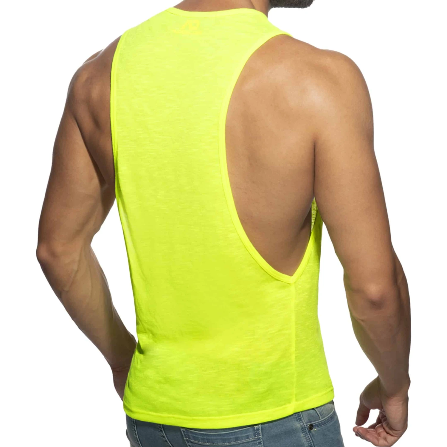 Débardeur en microfibre flammée trÚs fine, légÚre, et semi-transparente. Large ouvertures sous les bras. Imprimé Addicted ton sur ton sur la poitrine et dans le dos.