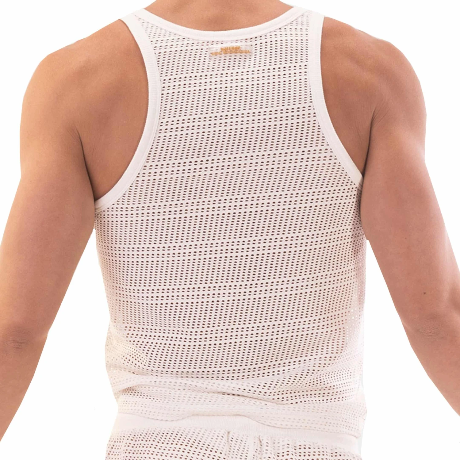 Débardeur trÚs sexy totalement transparente. Coupe ajustée. Col rond. Etiquette Barcode en silicone en haut du dos.