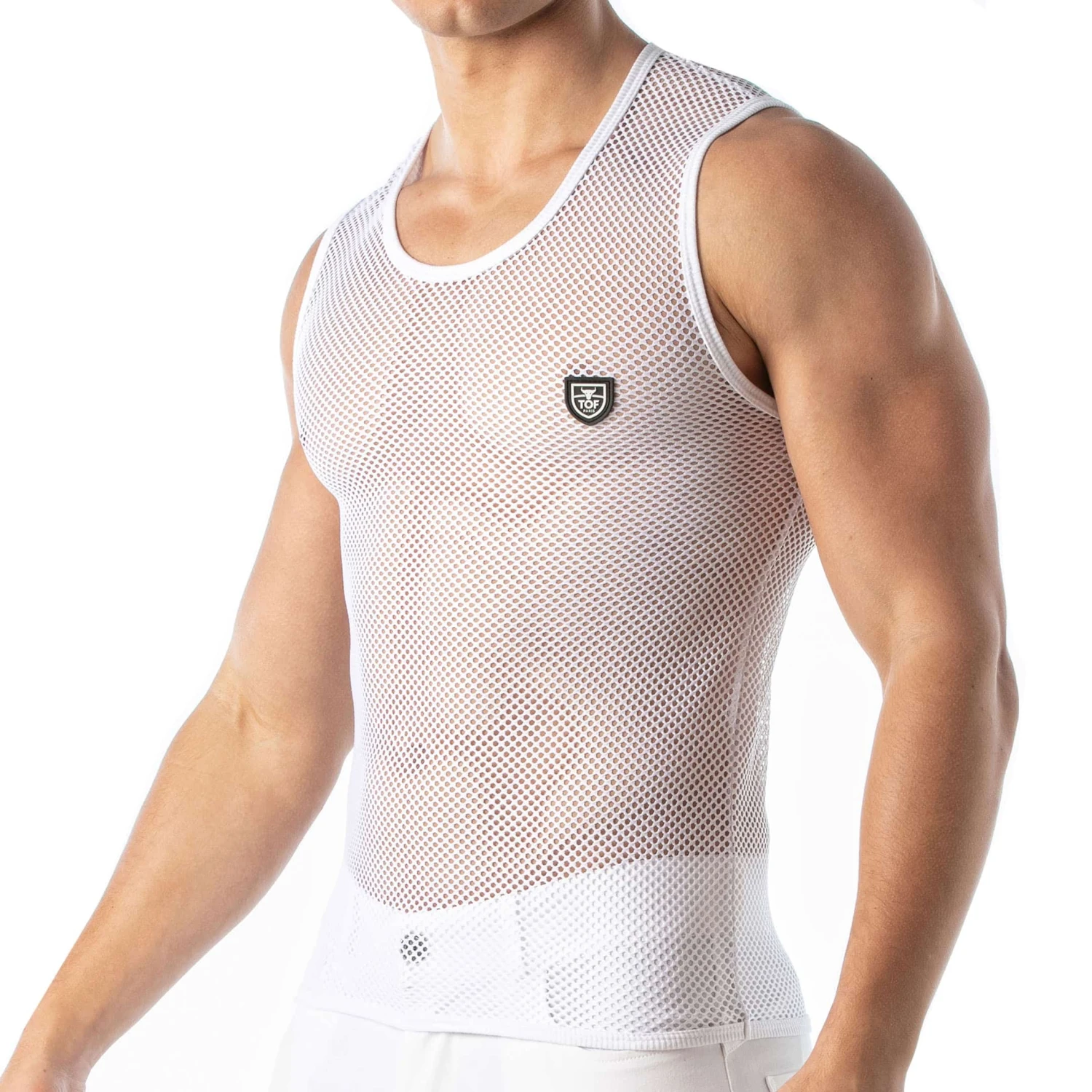 Débardeur ajouré en maille transparente. Coupe ajustée. Logo TOF Paris en silicone sur la poitrine. Fabrication française.