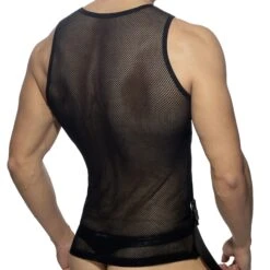 Débardeur très sexy en résille transparente. Design original et innovant avec sa doublure sur le torse qui intègre 2 sangles ajustables avec clips fonctionnels. Logo AD Fetish en silicone cousu sur la poitrine.