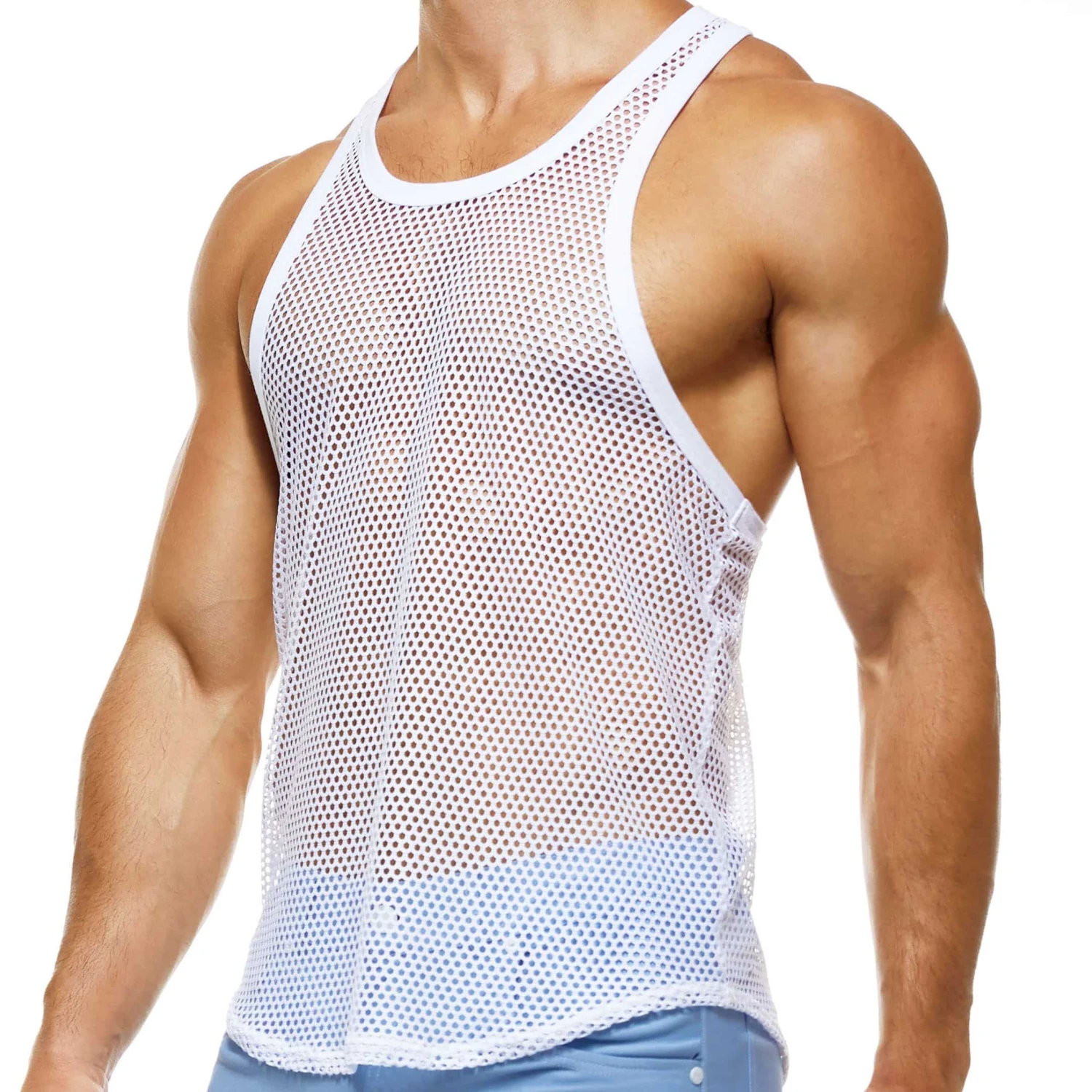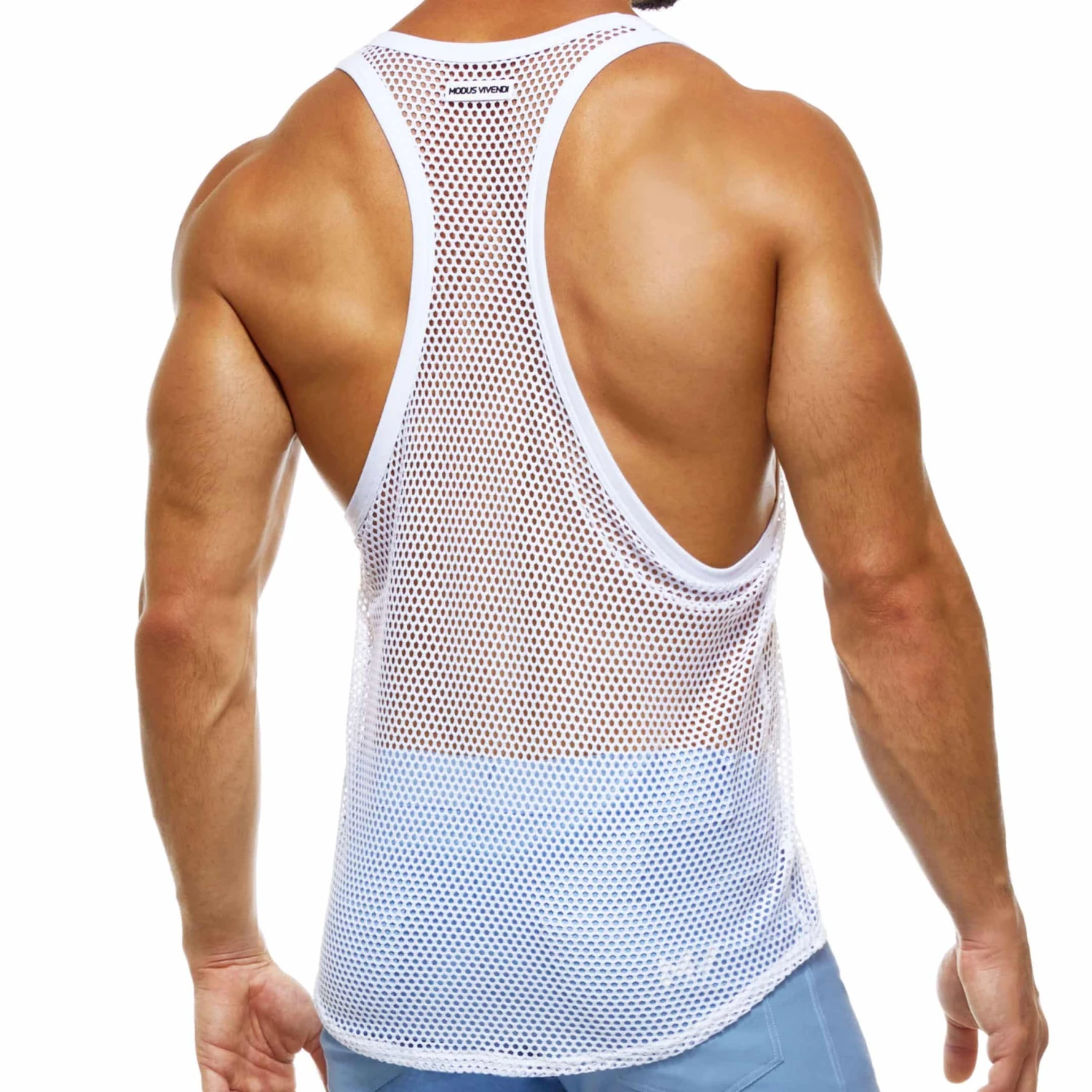 Débardeur en large maille semi-transparente. Coupe ajustée pour mettre en valeur votre musculature. Dos nageur. Tombé arrondi parfait sur un jean ou un short. Logo MV en haut du dos.