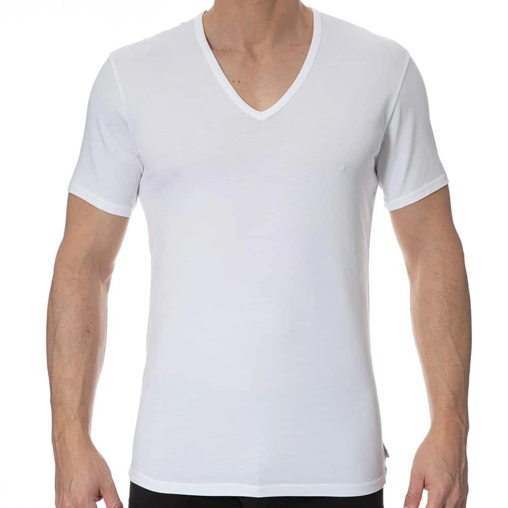 Lot de 2 t-shirts en coton stretch uni, doux et agréable à porter. Coupe simple et ajustée. Col en V et manches courtes.