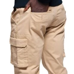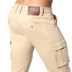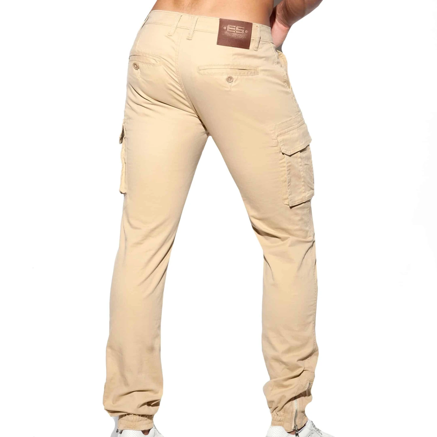 Pantalon cargo en toile de coton de couleur unie. Coupe slim ajustée. 6 poches dont 2 plaquées avec rabat sur les cuisses. Bande élastique zippée à la cheville. Passants de ceinture. Braguette à fermeture Eclair et 1 bouton. Etiquette ES Collection.