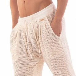 Pantalon sexy en résille non doublée pour une totale transparence. Coupe décontractée. Deux poches sur les cÎtés. Ceinture élastique avec cordon de serrage. Logo en silicone sur la hanche gauche.