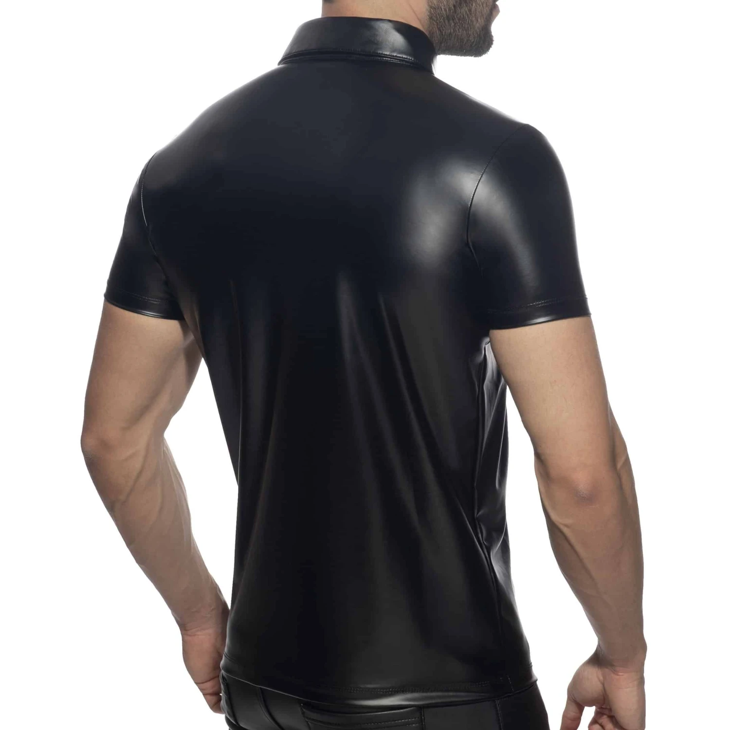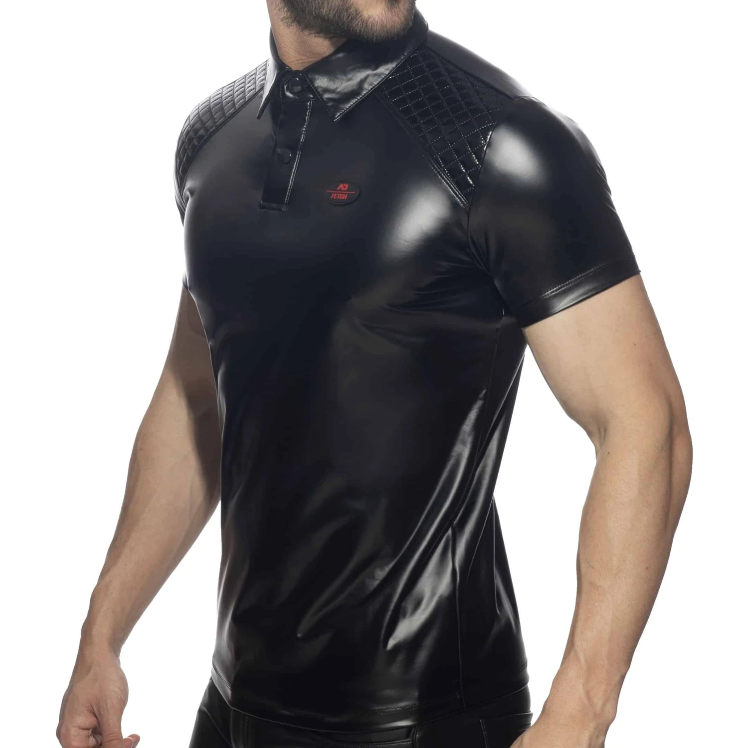 Polo trÚs ajusté en microfibre brillante imitant le caoutchouc, pour un look trÚs fetish. Col chemise avec deux boutons-pression. EmpiÚcements matelassés brillants sur les épaules. Logo AD Fetish en silicone sur la poitrine gauche.