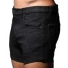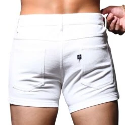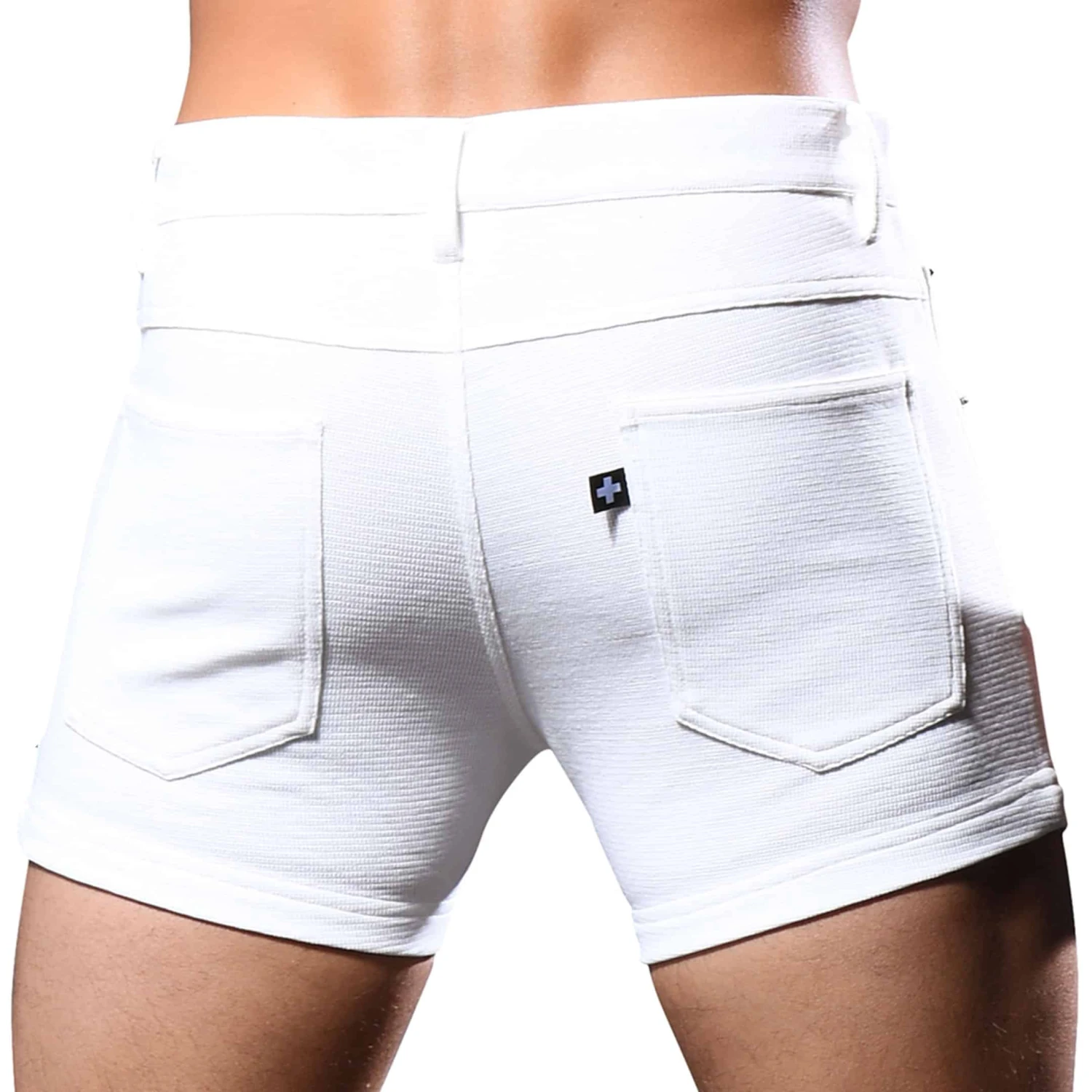 Short en mélange extensible et respirant de coton et de microfibre imitant le jeans. Coupe skinny, taille basse, et très sexy. 5 poches. Braguette à fermeture Eclair et 1 bouton. Passants de ceinture. Rivets métalliques. Taille US. Edition Limitée.