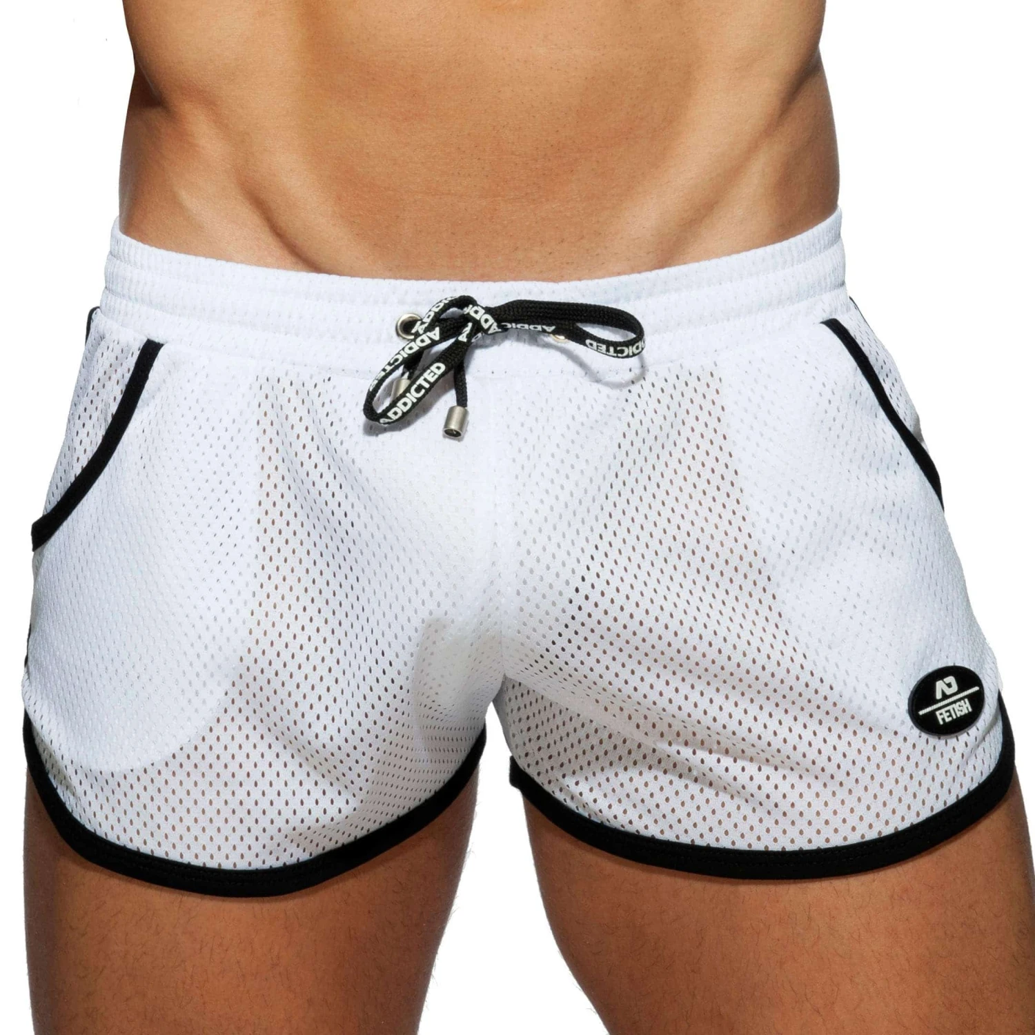 Short sport taille basse en mesh ajouré transparent. Coupe courte, rétro, échancrée sur les cÎtés. Bordures de couleur contrastée. Poche intérieur Kango pour un grand confort frontal. 2 poches. Logo AD Festish en silicone cousu sur la cuisse gauche. Ceinture élastique avec cordon de serrage.