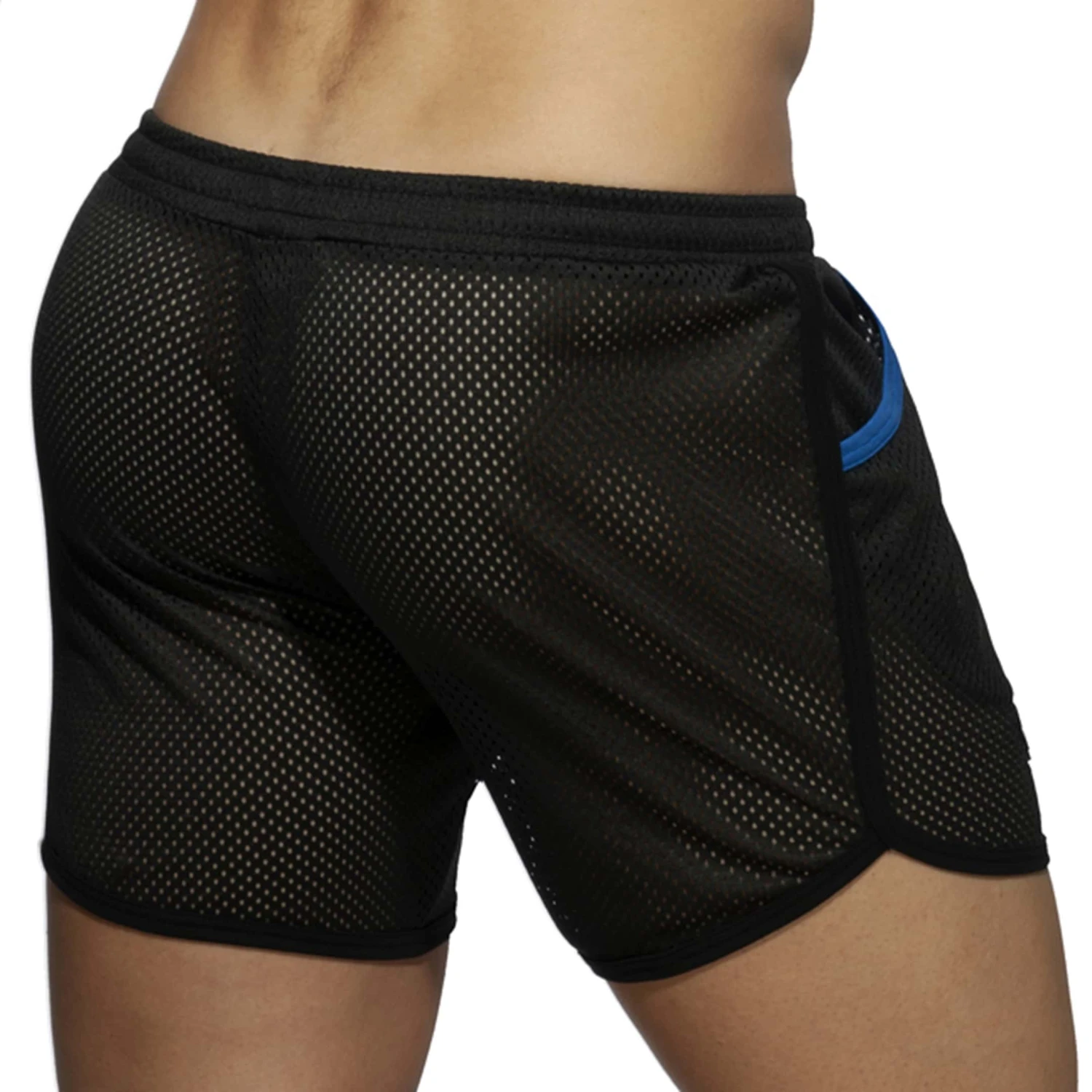 Short mi-cuisse en mesh sport non doublé pour une grande transparence. Coupe rétro et échancrée sur les côtés. 1 poche. Logo AD Fetish en silicone sur la cuisse droite. Ceinture élastique.