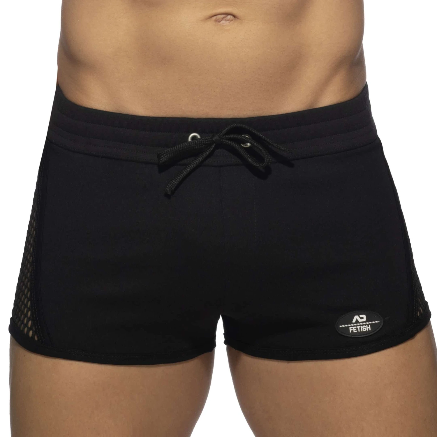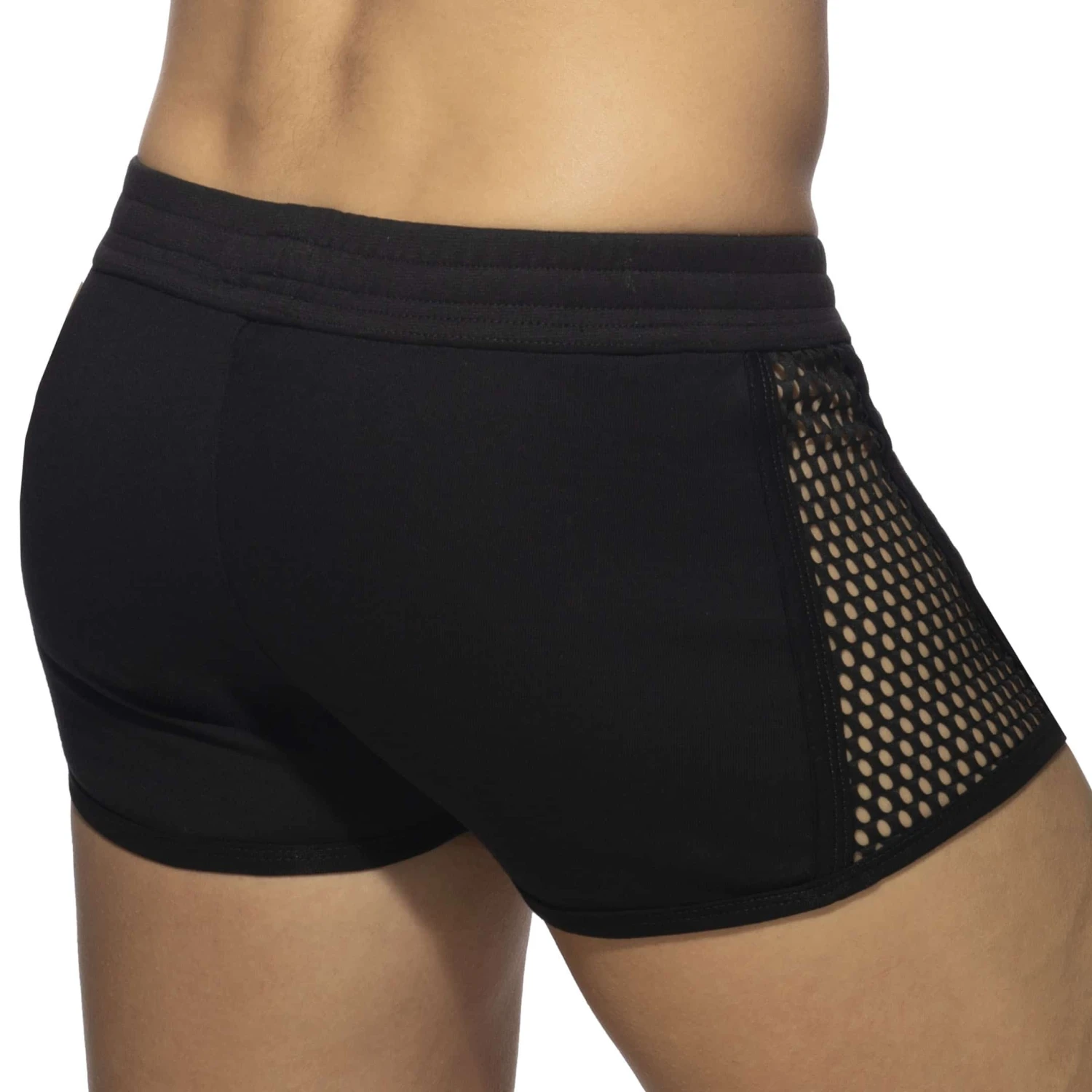 Short sexy en coton doux. Panneaux transparents en résille à maillage large sur les côtés. Poche intérieur Kango pour un grand confort fronta. Ceinture élastique recouverte avec cordon de serrage. Logo AD Fetish en silicone sur la cuisse gauche.