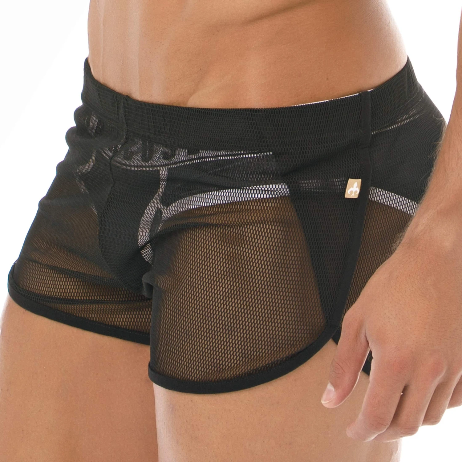 Short sport et sexy en mesh ajouré et totalement transparent. Coupe échancrée sur le cÎté. Non doublé. Ceinture élastique à la taille. Logo Marcuse en métal sur la fesse droite. Slip vendu séparément.