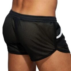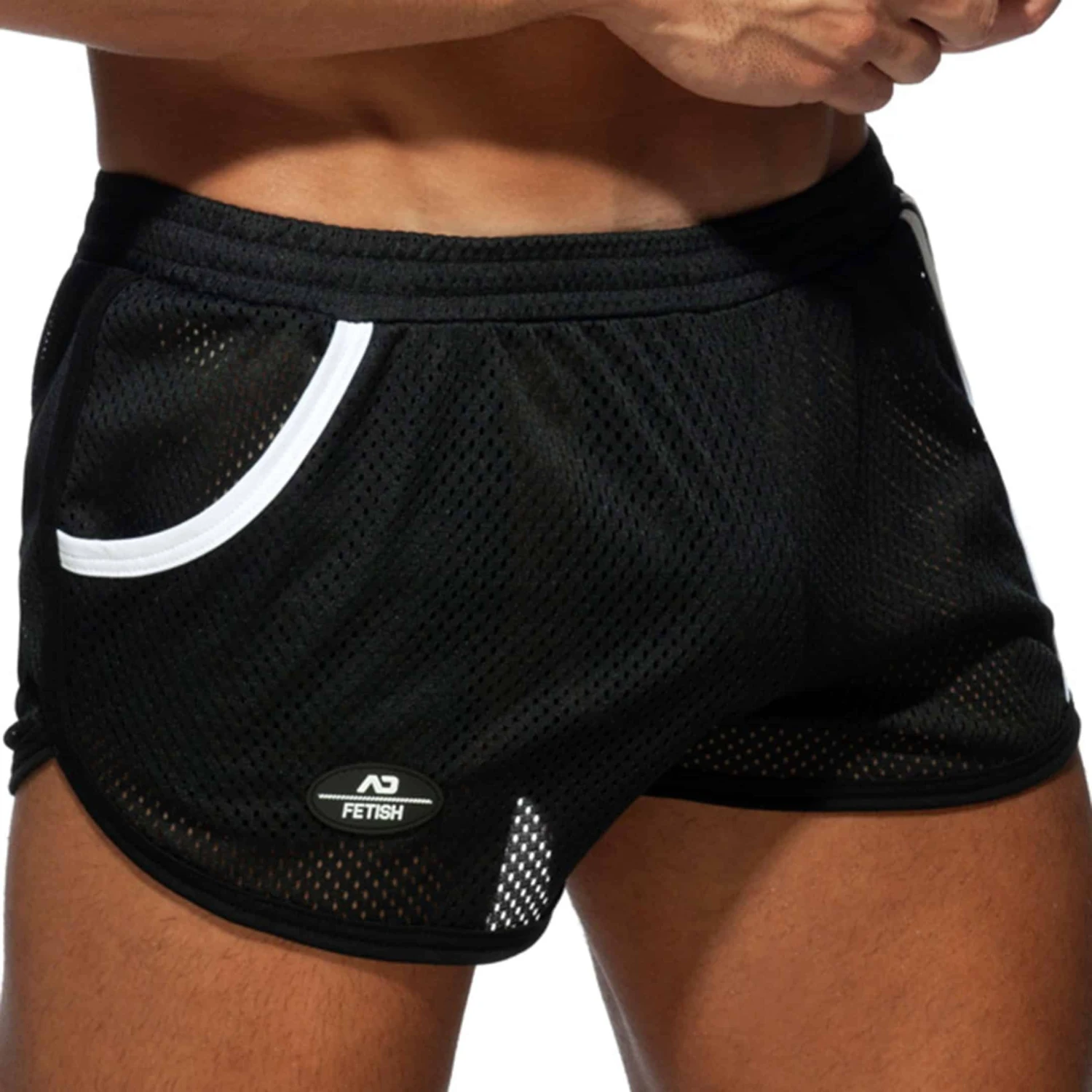 Short taille basse en mesh sport non doublé pour une grande transparence. Non doublé. Coupe courte, rétro, échancrée sur les cÎtés. 1 poche. Logo AD Fetish en silicone. Ceinture élastique.
