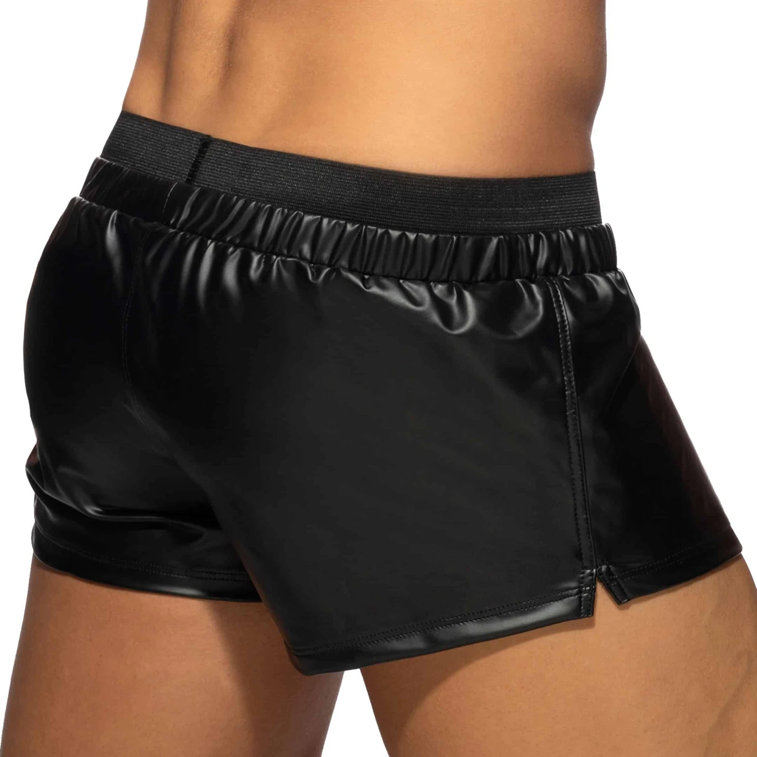 Short taille basse trÚs sexy en microfibre brillante imitant le caoutchouc, pour un look trÚs fetish. Coupe courte et ajustée. Logo AD en silicone sur la ceinture élastique.