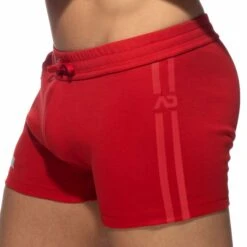 Short athlétique de couleur unie. Double bande sport de chaque cÎté. Ceinture élastique avec cordon de serrage. Poche à fermeture Eclair sur la cuisse droite. Logo AD en silicone.