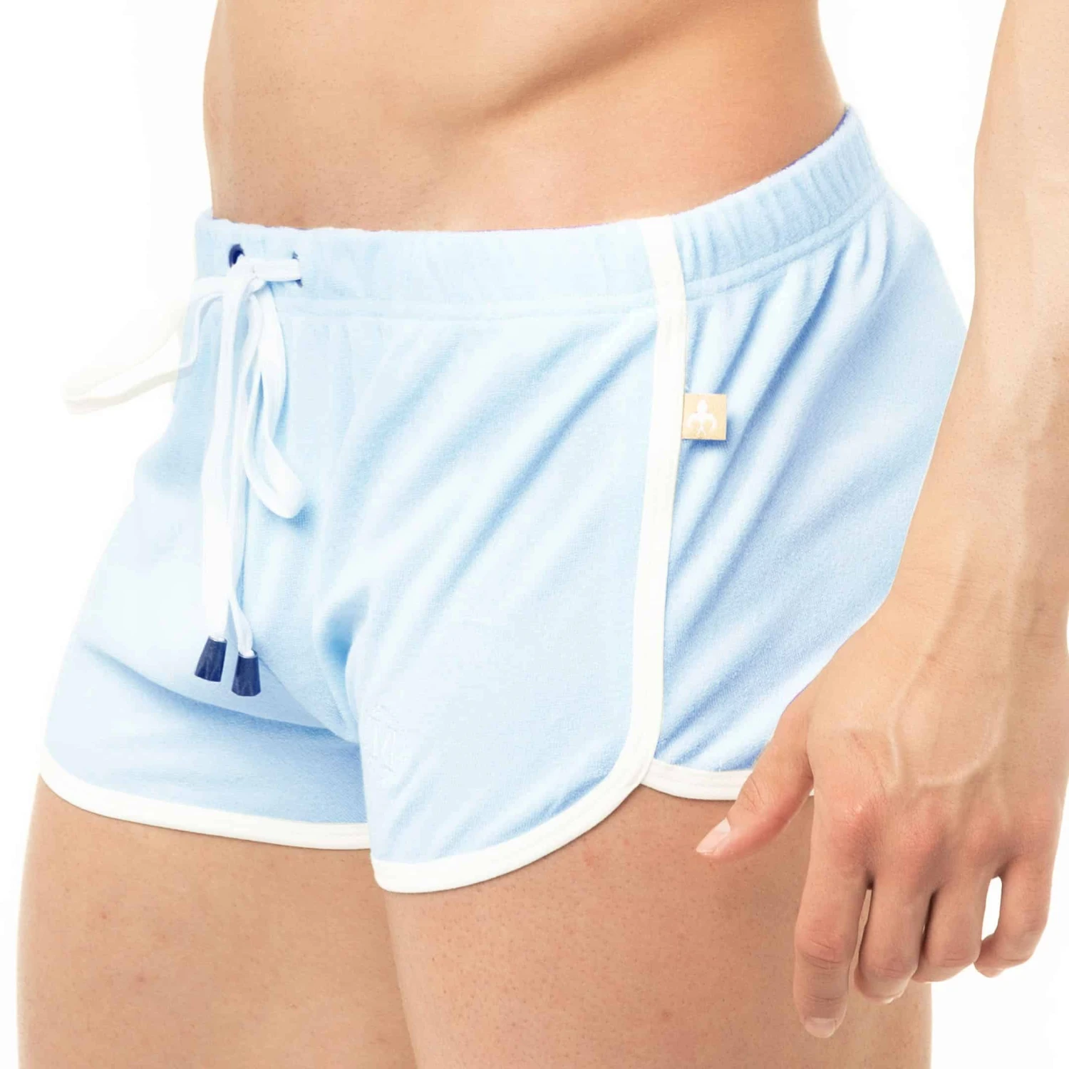 Short sport taille basse en coton éponge, doux et confortable. Coupe rétro, trÚs ajustée, et échancrée sur les cÎtés. Logo Marcuse brodé sur la cuisse gauche. Ceinture élastique avec cordon de serrage.