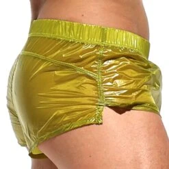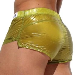 Short très sexy en tissu transparent et ultra léger. A porter par-dessus un maillot de bain ou sans rien dessous ! Coupe courte et échancrée sur le côté. Braguette factice. Ceinture élastique recouverte signée Rufskin. Fabriqué en Californie.