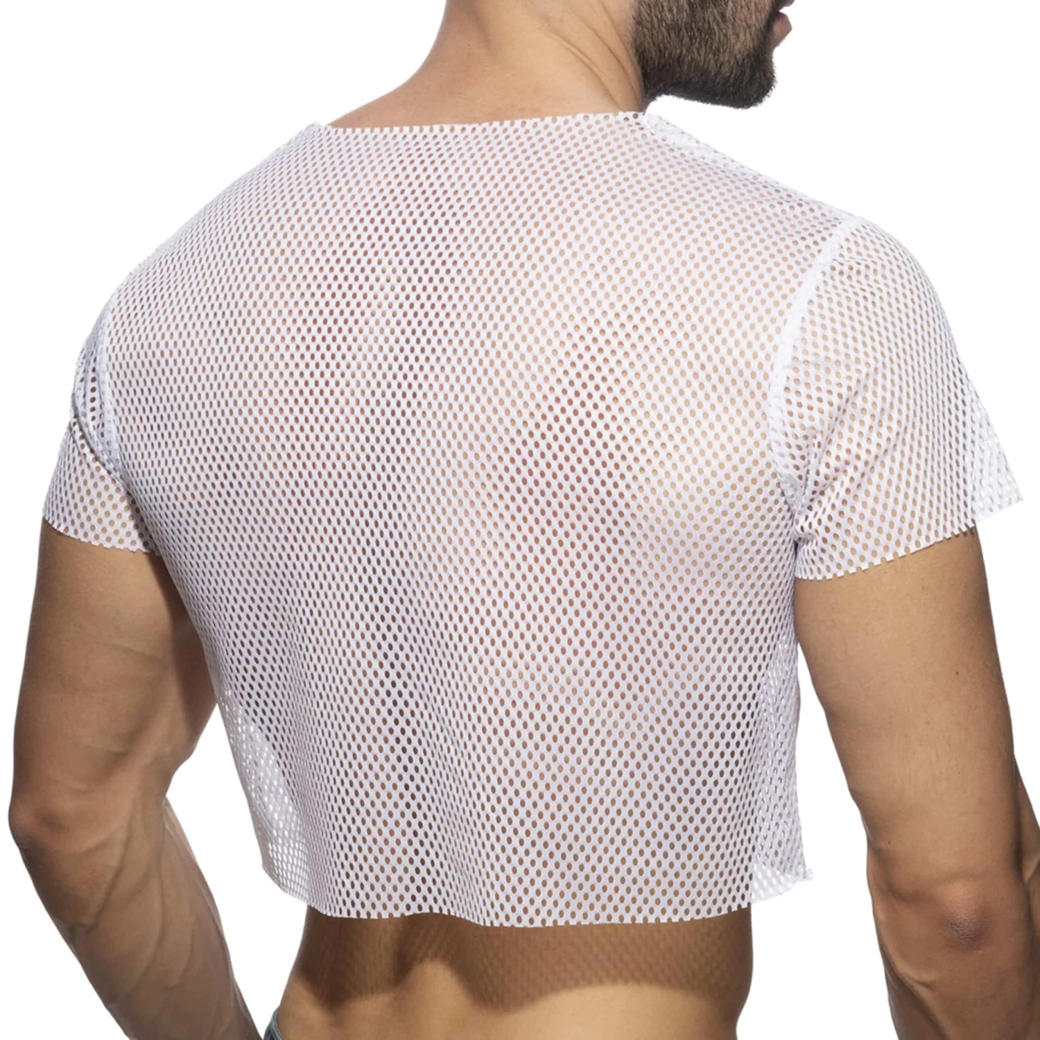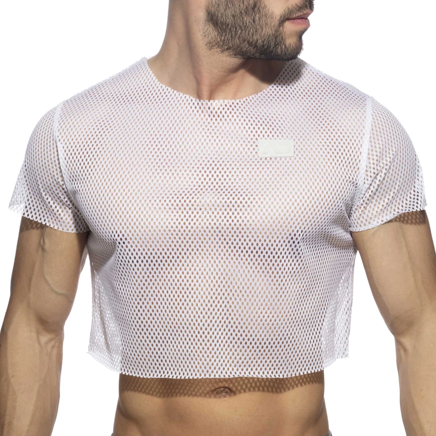 Top crop oversize en résille transparent à larges mailles Manches courtes et col rond. Logo AD en silicone sur la poitrine.