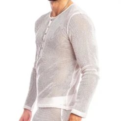T-shirt en rĂ©sille transparente 100% coton. Manches longues et col tunisien. Logo L’homme Invisible en haut du dos.