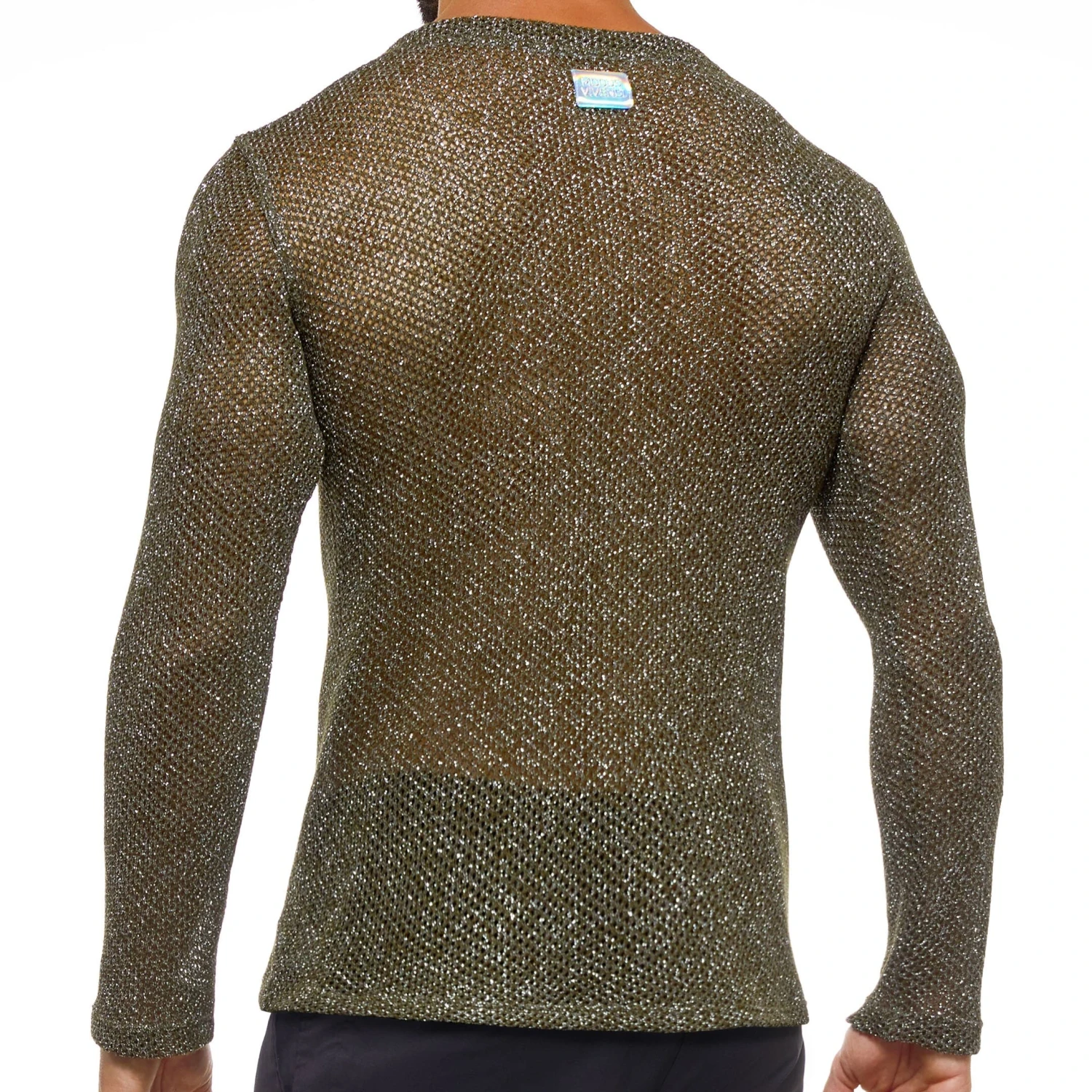 T-shirt transparent en tissu tricoté extensible contenant des fils métallisés Lurex, pour un parfait effet cotte de mailles. Coupe ajustée avec col en V profond et manches longues. Etiquette Modus Vivendi cousue dans le dos. Fabriqué en GrÚce.