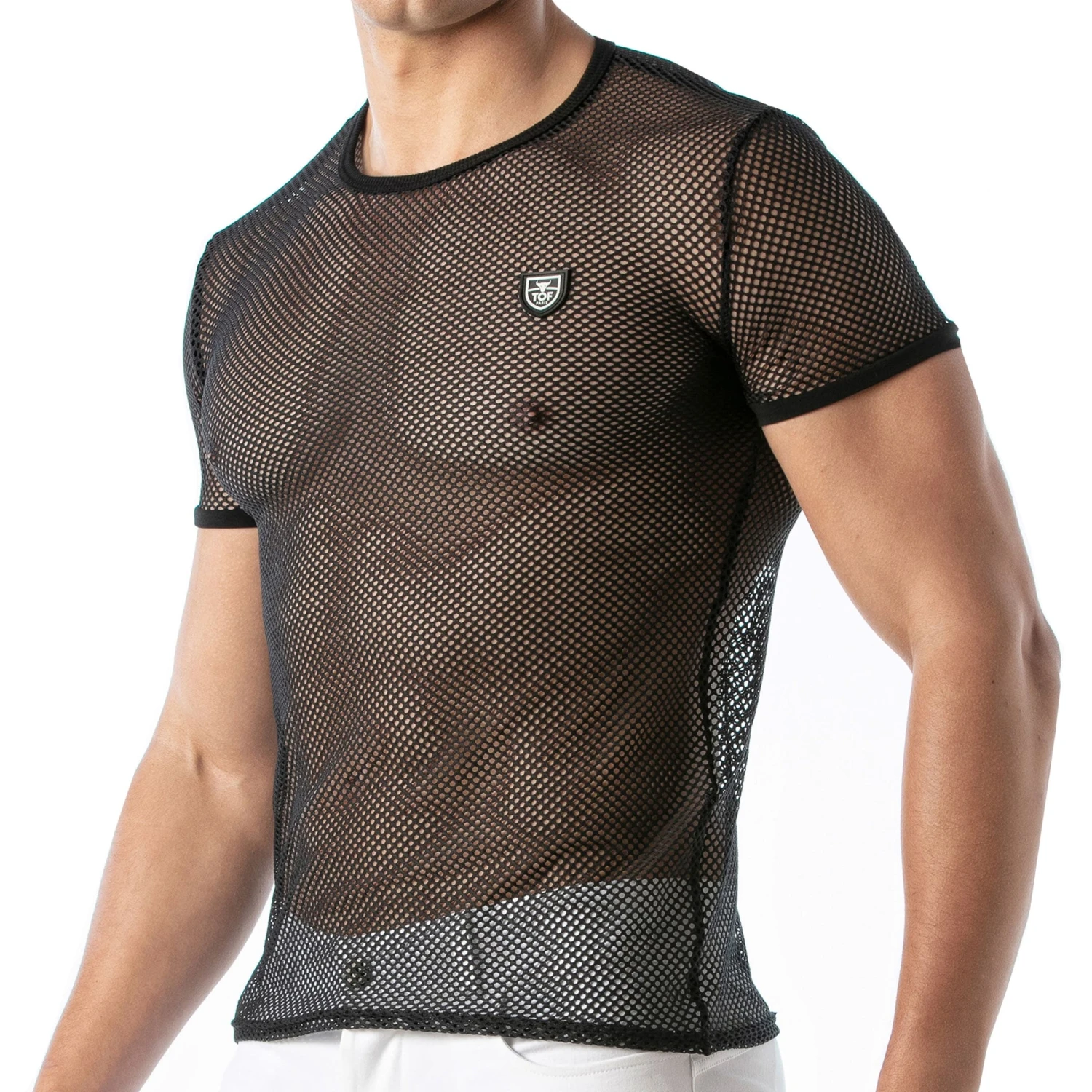 T-shirt ajouré en maille transparente. Coupe ajustée. Manches courtes et col rond. Logo TOF Paris en silicone sur la poitrine. Fabrication française.
