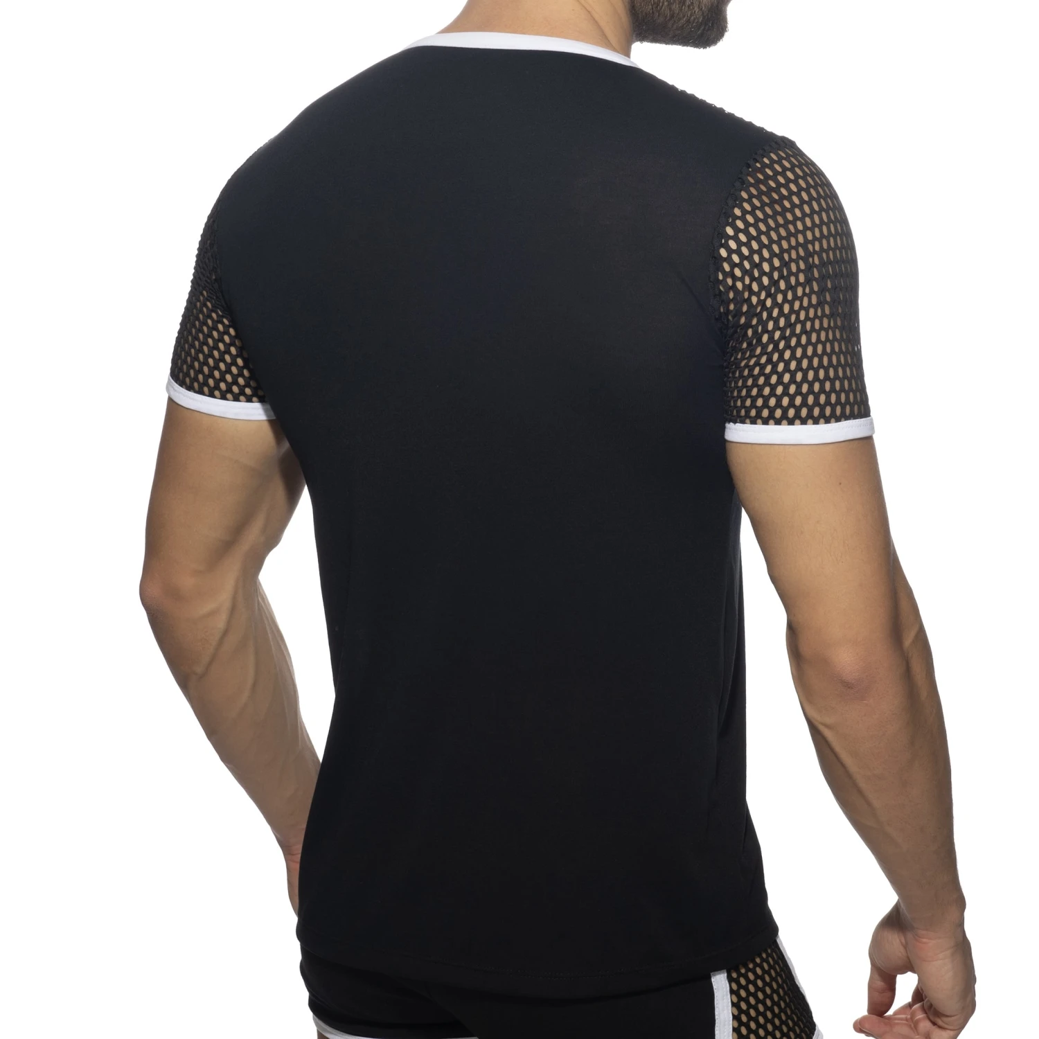 T-shirt sexy en tissu doux et confortable. Haut du torse et manches en résille à maillage large. Col en V et manches courtes. Double bande horizontale sur la poitrine. Logo AD Fetish en silicone.