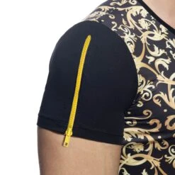 T-shirt sexy en microfibre douce et légÚre. Motif baroque doré inspiré de Versailles. Col en V. Manches courtes de couleur noire. Fermeture Eclair contrastée sur la manche droite. Logo AD en silicone sur la poitrine.