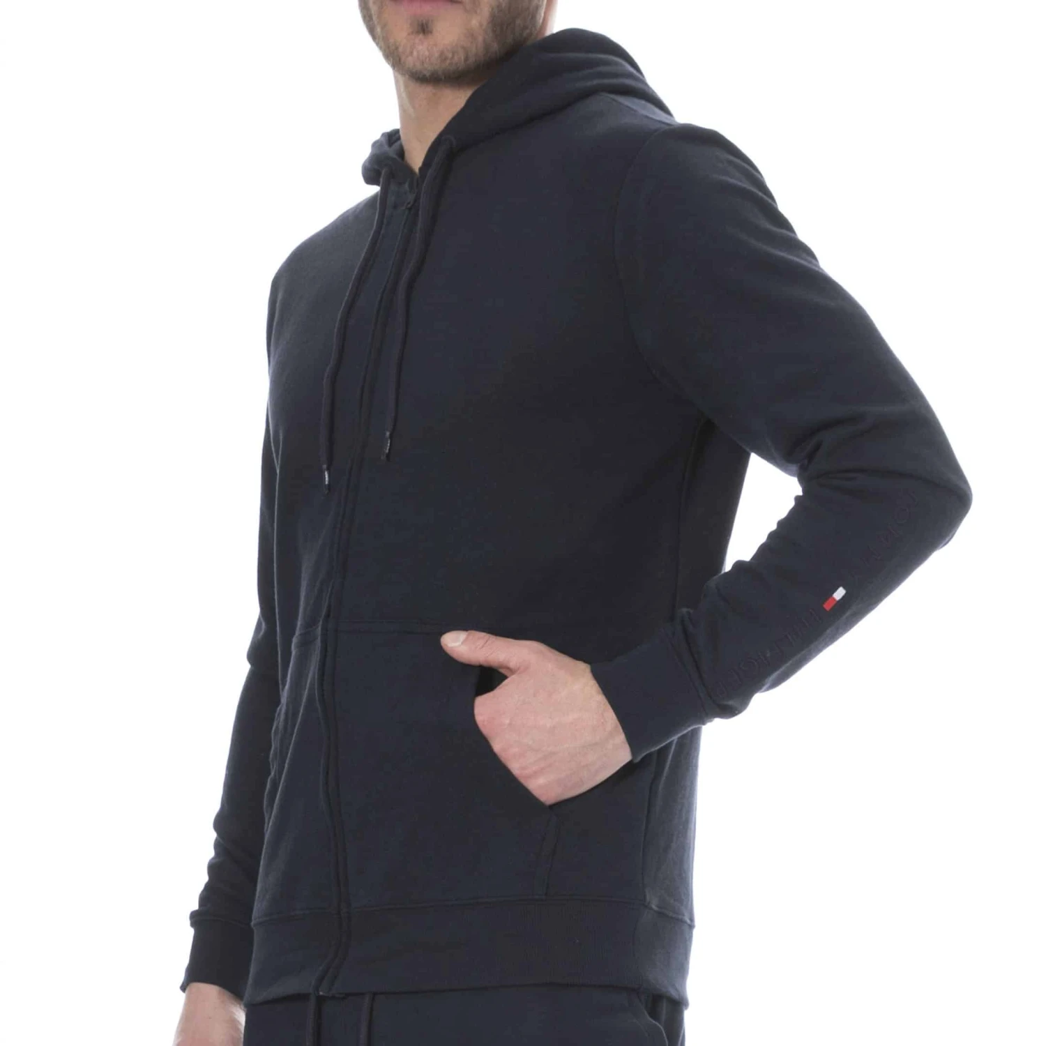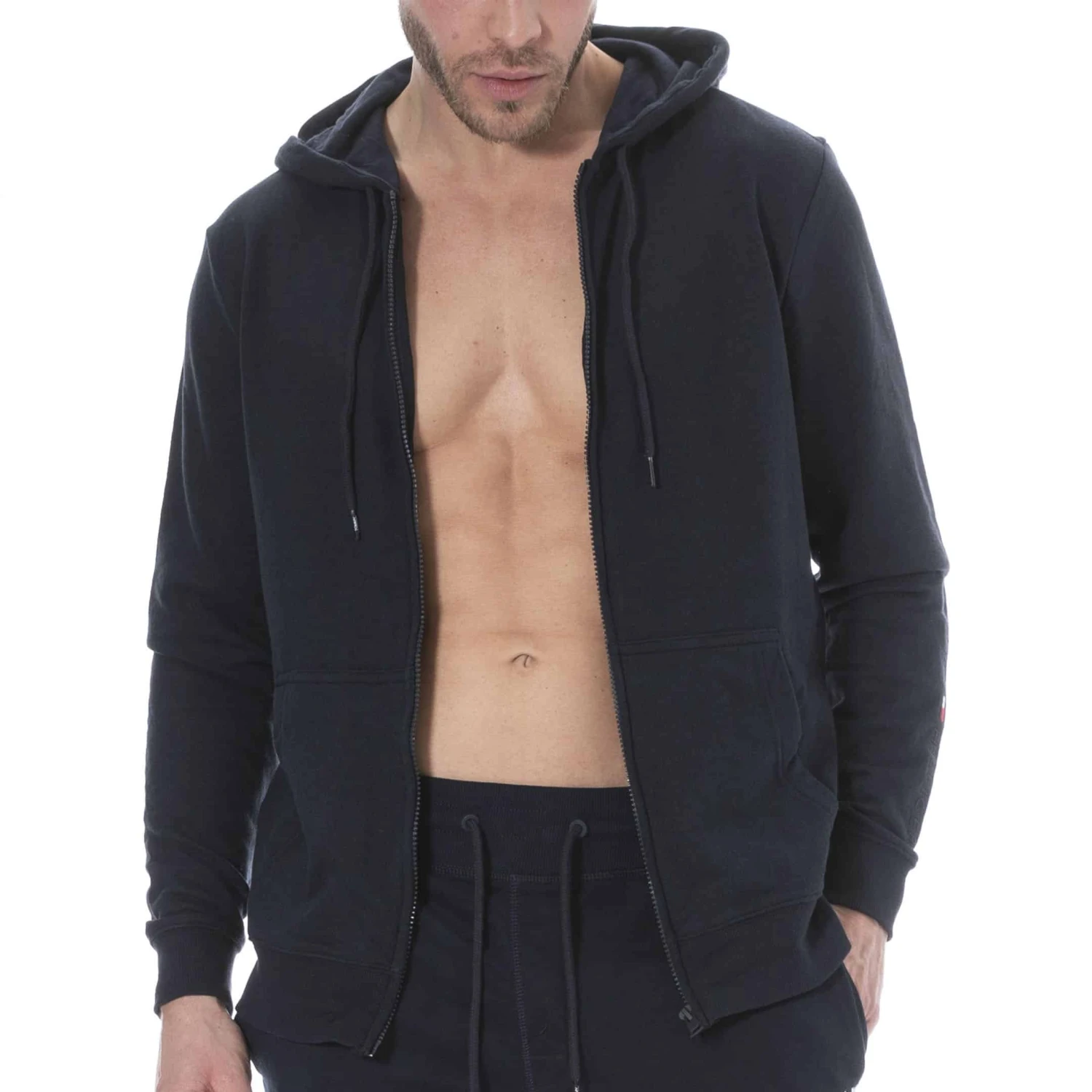 Veste en coton mélangé doux et confortable. Capuche avec cordon de serrage. Fermeture éclair intégrale. 2 poches. Bandes élastiquées à la taille et aux poignets. Drapeau iconique et logo ton-sur-ton brodés sur la manche gauche. Pantalon vendu séparément.