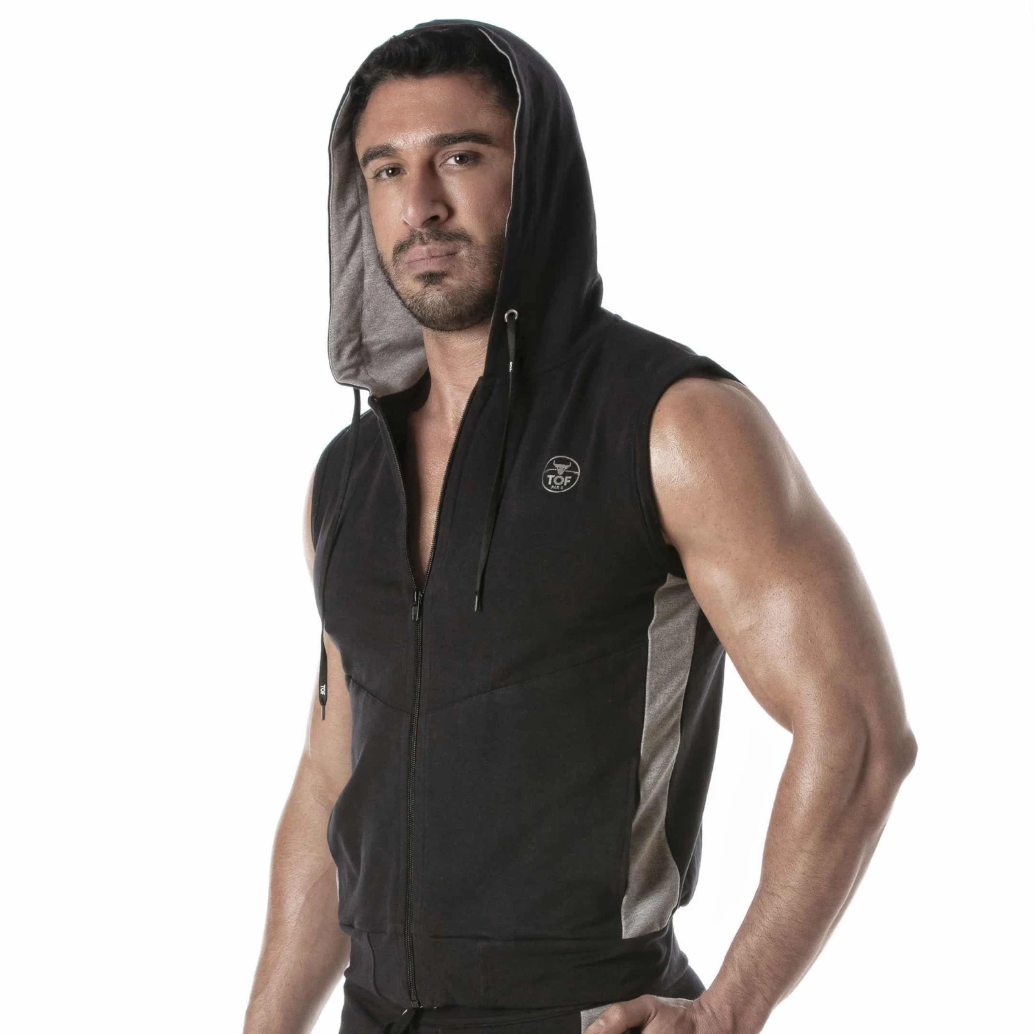 Veste sport sans manche en coton éponge super doux et respirant. Fermeture Eclair intégrale. 2 grandes poches. Capuche avec cordon de serrage. Détails de couleur contrastée. Bande élastiquée à la taille. Logo TOF Paris imprimé sur la poitrine. Fabrication française.