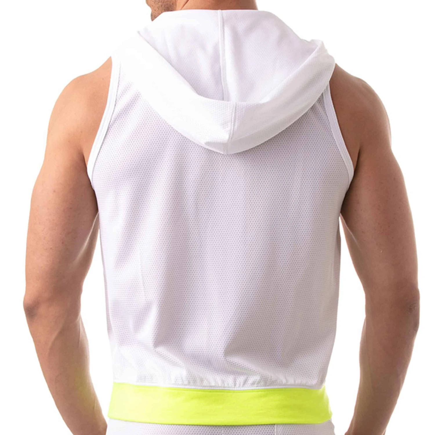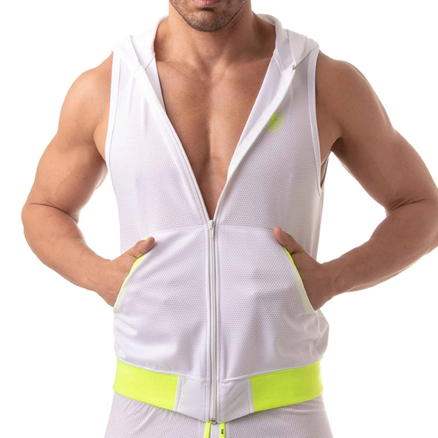 Veste sport sans manche en mesh léger et respirant. Fermeture Eclair intégrale. 2 grandes poches. Capuche. Détails de couleur contrastée. Bande élastiquée à la taille. Ecusson TOF Paris imprimé sur la poitrine. Fabrication française.