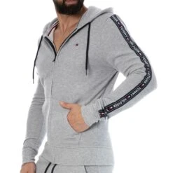 Veste en coton doux et confortable. Capuche avec cordon de serrage. Bande sport signée Tommy Hilfiger le long des manches. 2 grandes poches. Fermeture Eclair. Drapeau emblématique de la marque brodé sur la poitrine. Pantalon vendu séparément.